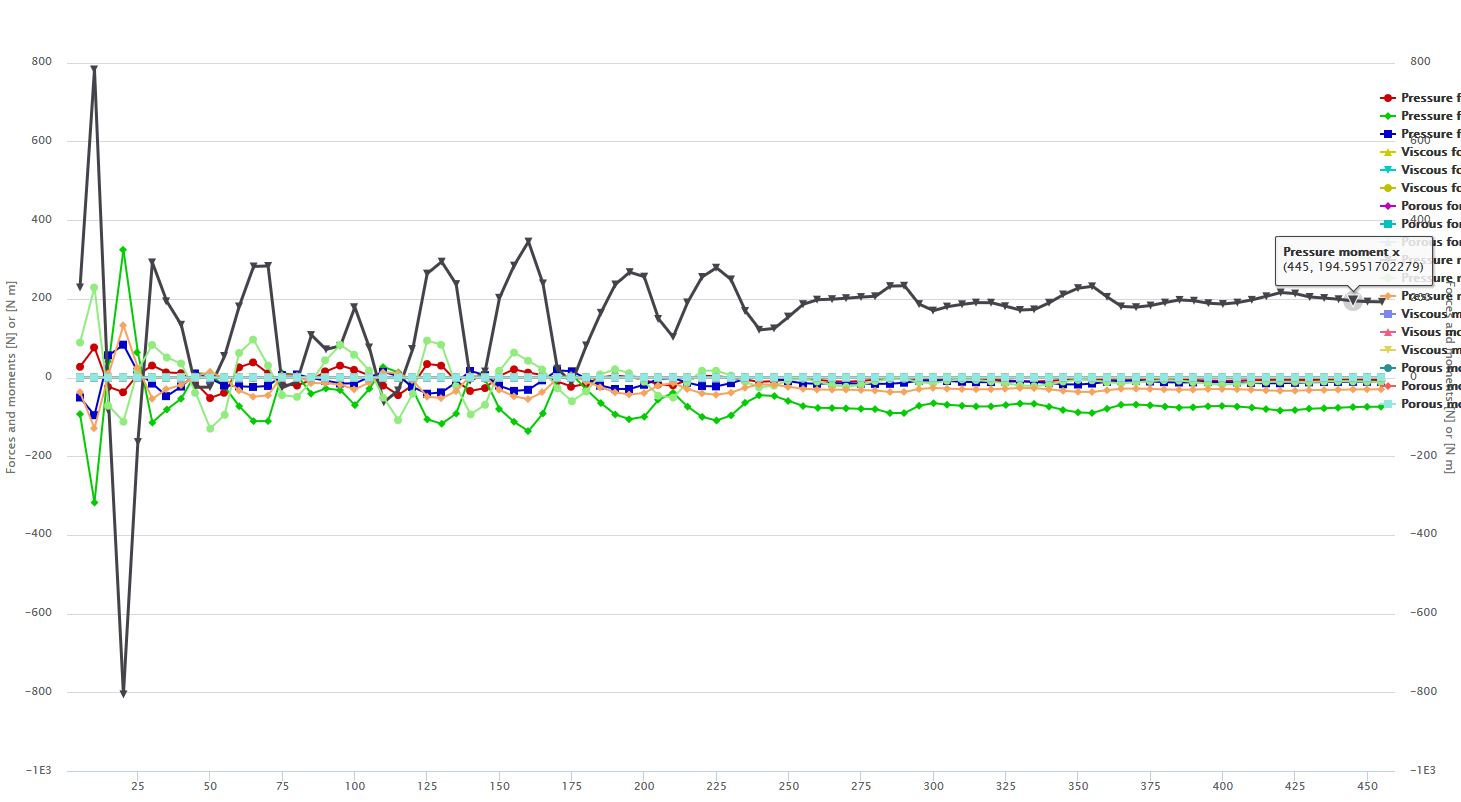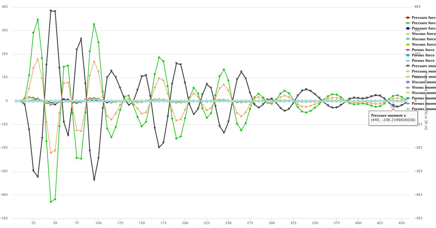 The simulation was actually in the process of converging. Referring to the force plots below, you can see that the numerical solution is starting to reach some sort of oscillatory convergence and maybe a steady-state if you’re lucky. I suggest letting the sim run all the way till the end time of 1500s and see what the final solution is.