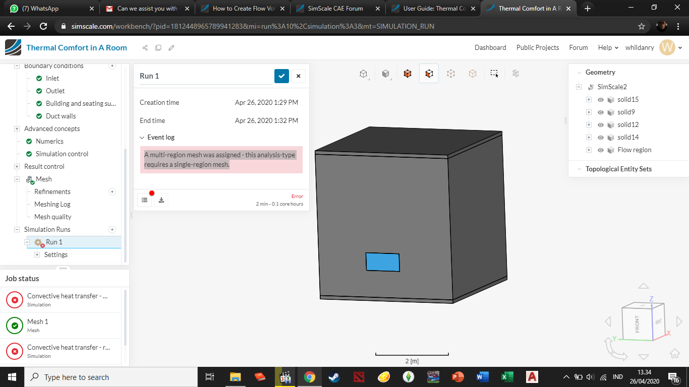 But, i got same error when i run my simulation “A multi-region mesh was assigned - this analysis-type requires a single-region mesh”.