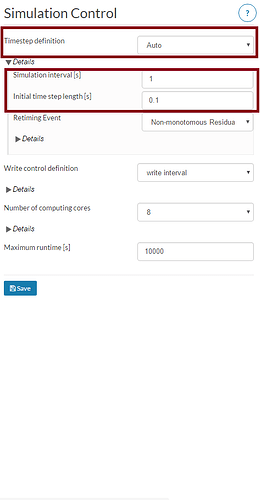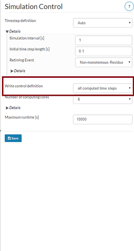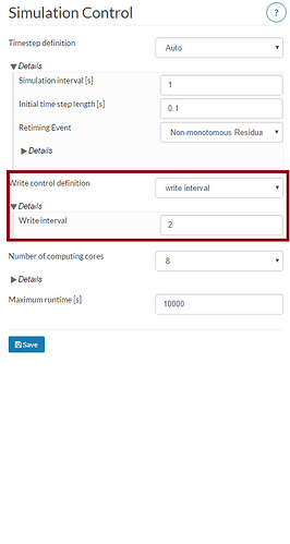 So we want to run a simulation for 1 sec with time step of 0.1. This means we want to record 10 time steps in total. The number of time steps to be stored can be controlled by ‘Write control definition’.