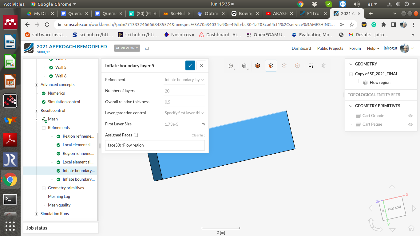 My problem is that I do not know if I’m solving the boundary layer in a correct way. For the resolution of my model I’m using the k-omega SST turbulence model. I’ve talked with SBlock a bit about it but I keep having problems regarding inflation layers.