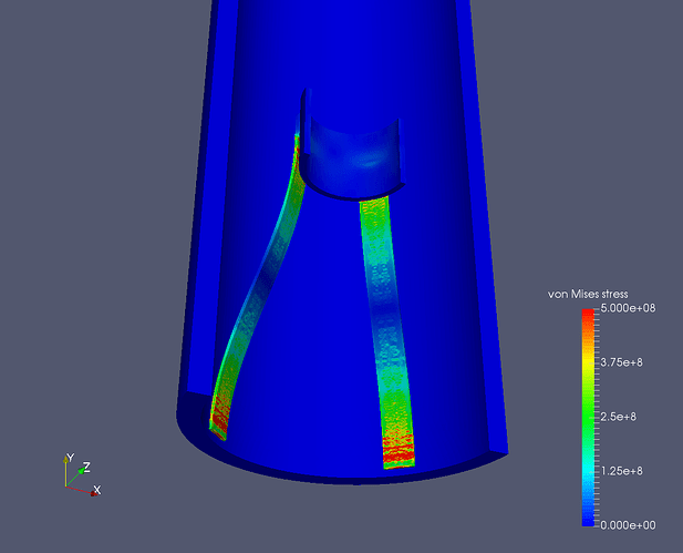 Despite these changes I could not get this simulation to solve (I think it’s related to the second order mesh). So I tried an alternative approach. Please see simulation Centralizer_Pipe_Fit 3. This uses a quarter model with a very fine first order mesh (three elements across each thickness).