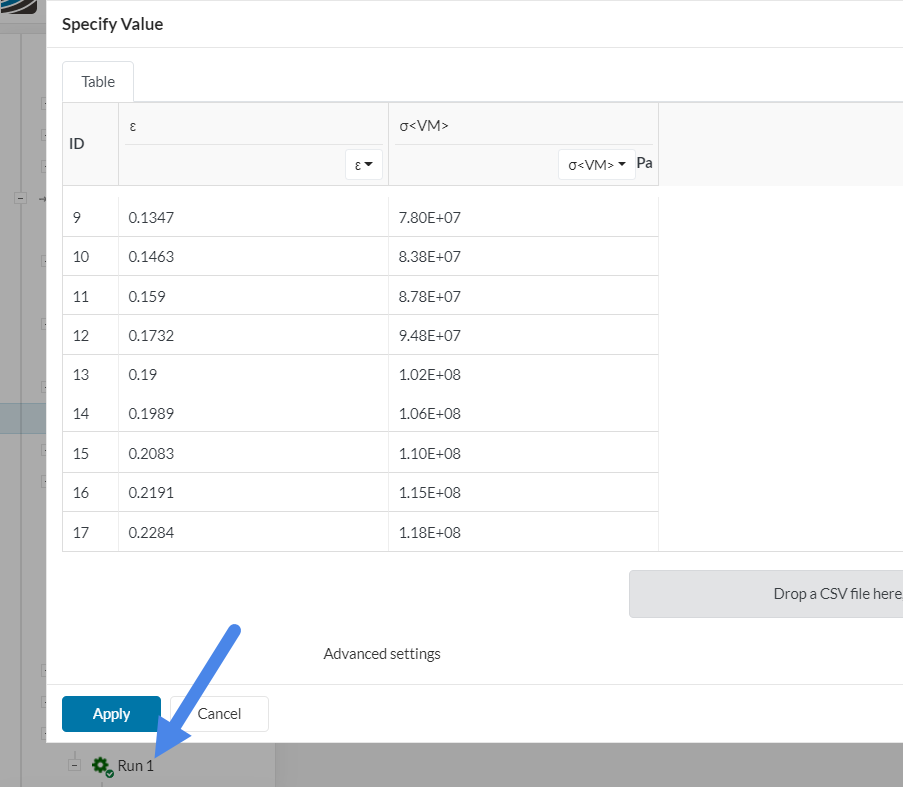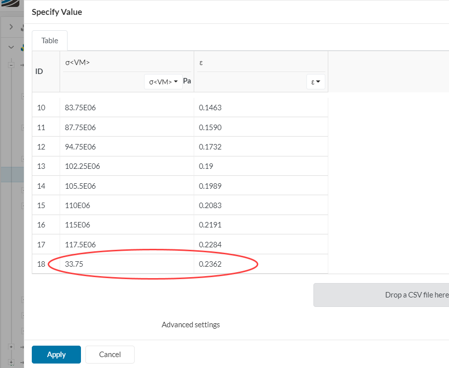 - There is also a bug, from what I can see. I noticed that you inverted the order of the columns. The default is strain to the left and stress to the right. If I run a simulation exactly like it is right now, only deleting the last line and inverting the order of the columns, it works.
