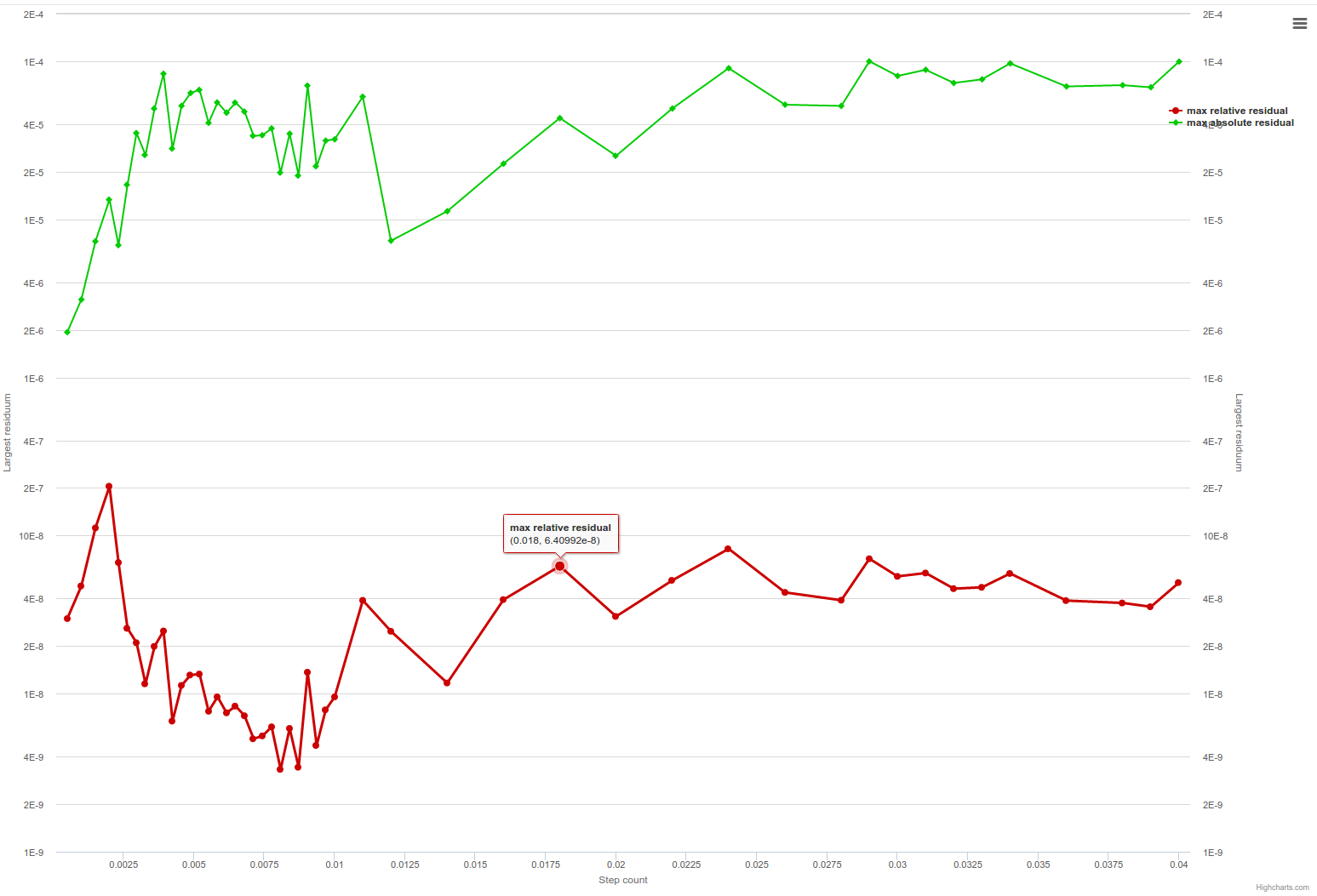 For example in above case, the relative error tolerance is set to 1e-6, then in one of the iteration if the relative error is reached until for example 1e-5 and the maximum iterations has been reached (i.e. 20 as in above case), then the solution will diverge and the timestep will cut down if Auto timestepping scheme was selected. On the other hand, 6.40 e-8 (highlighted in convergence plot figure above) will lead to converged solution.