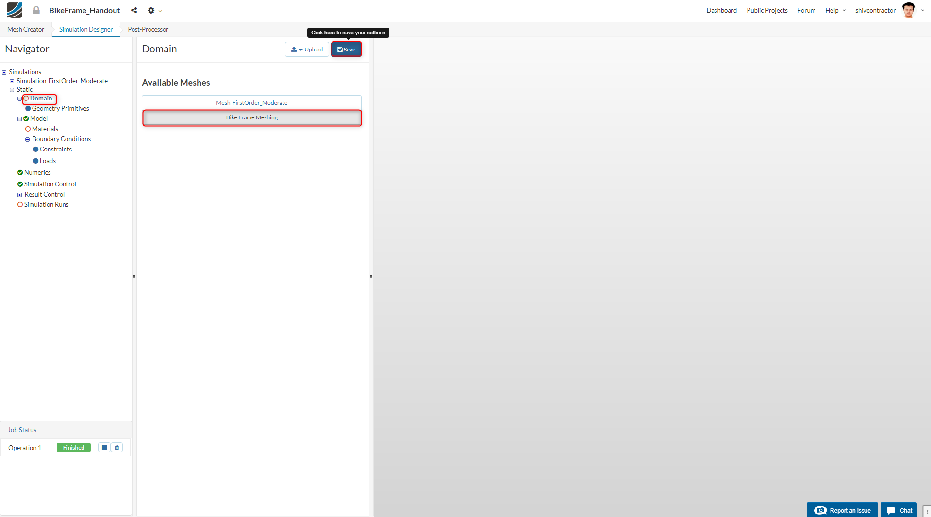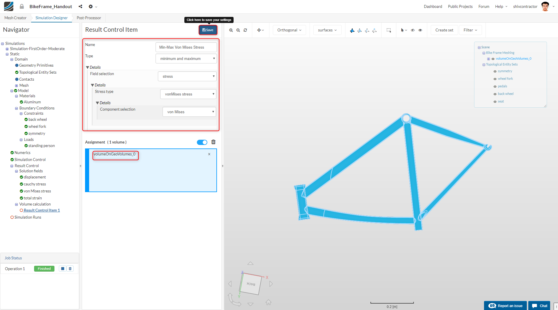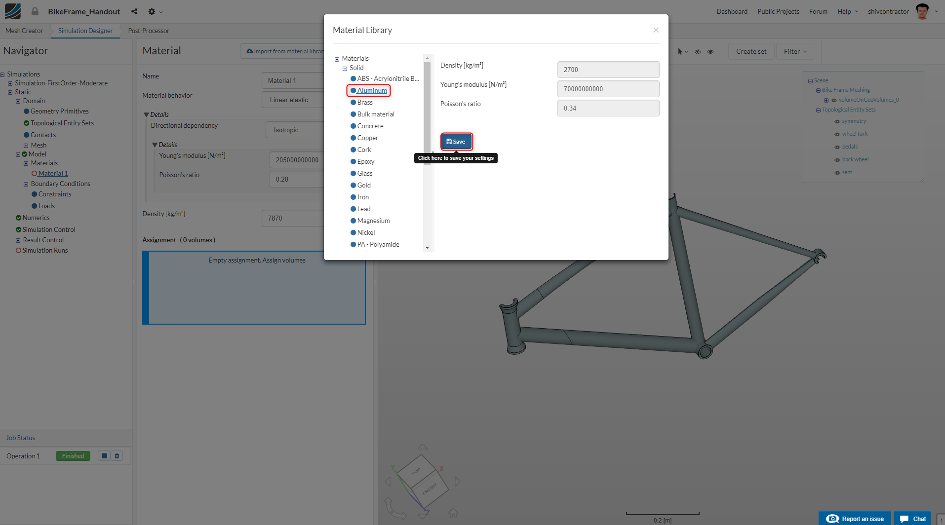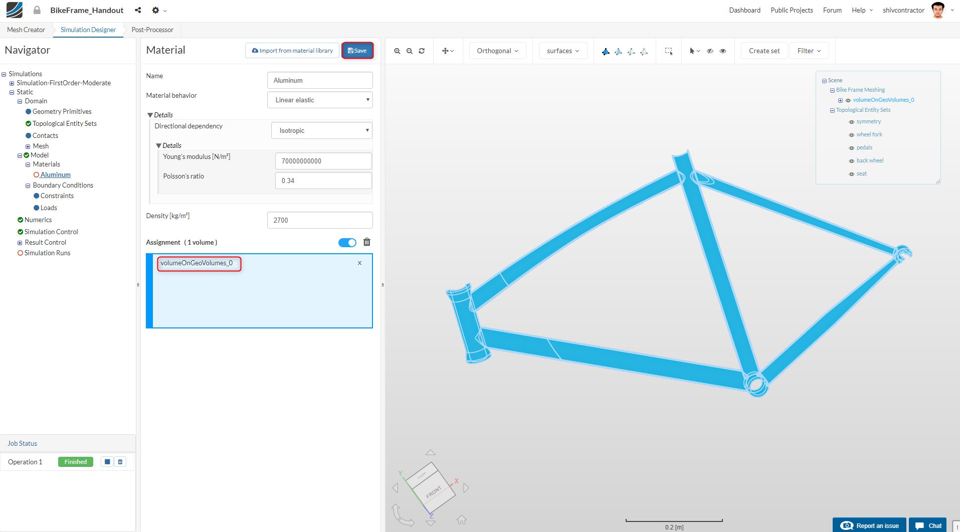 Assign the material to the entire bike frame (volume). To do this, click anywhere on the meshed geometry and highlight the material. Click Save to preserve the material settings.