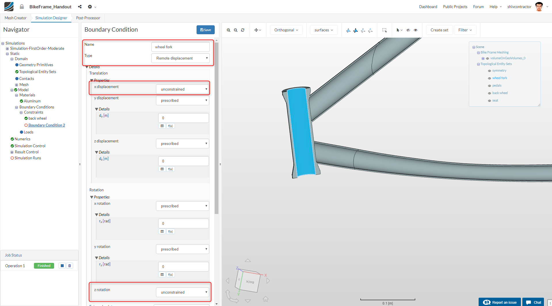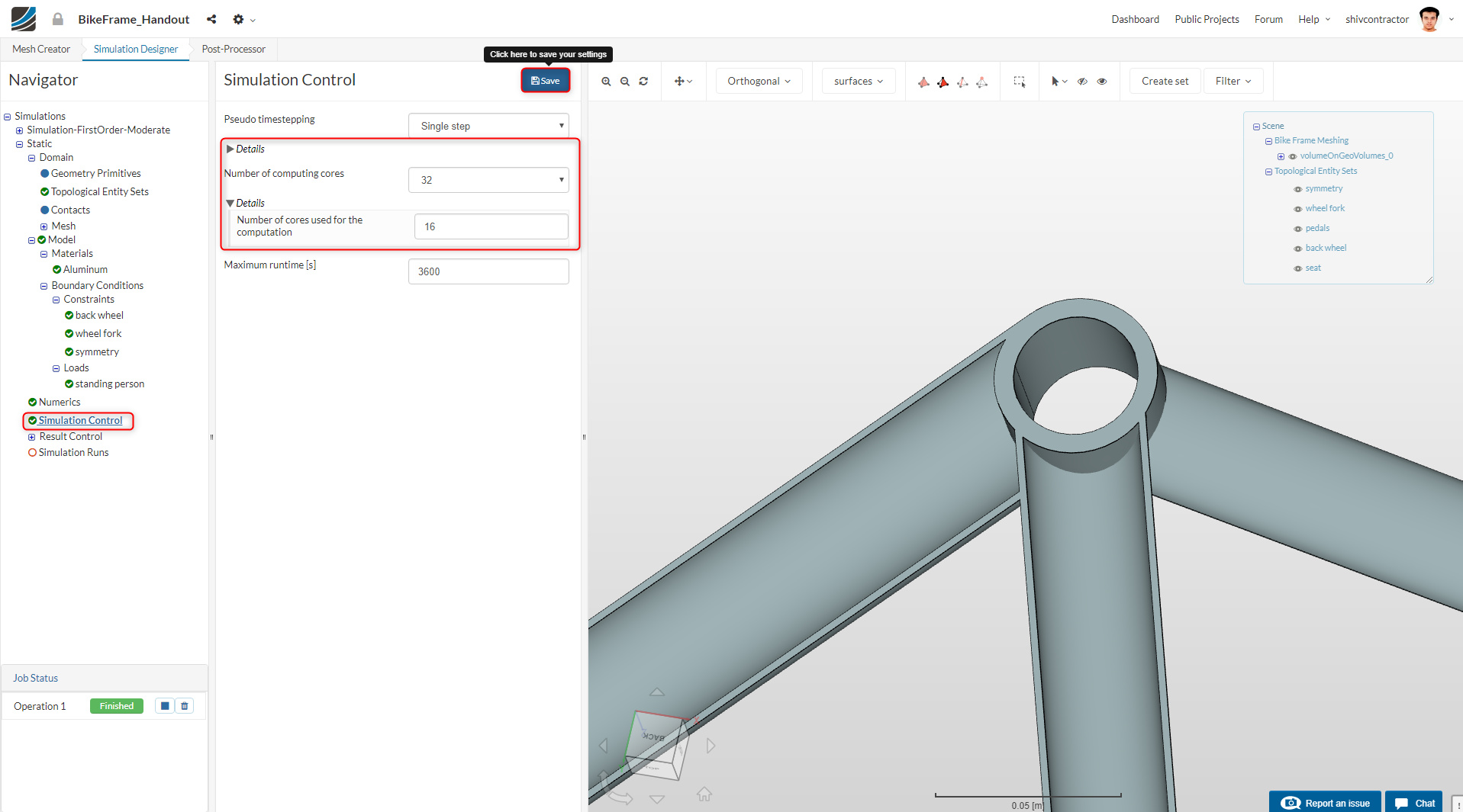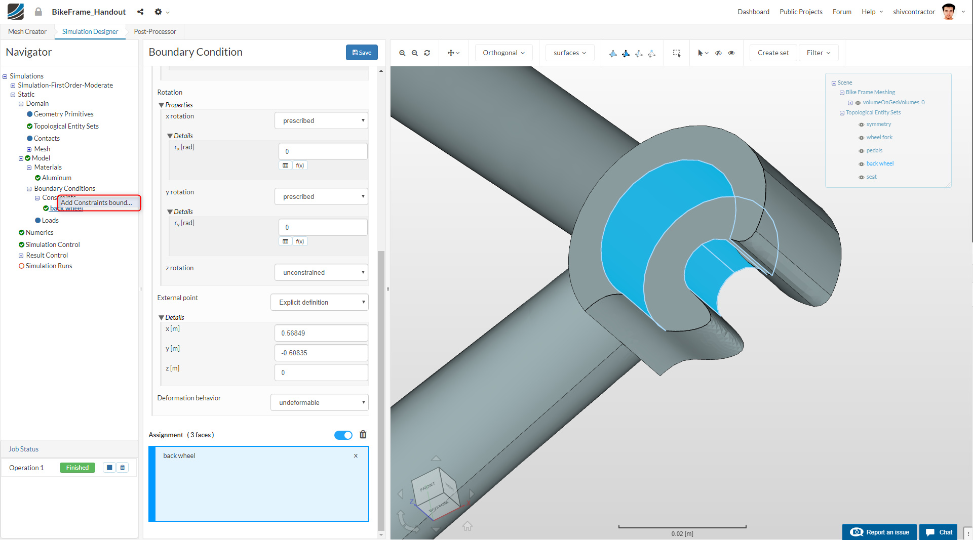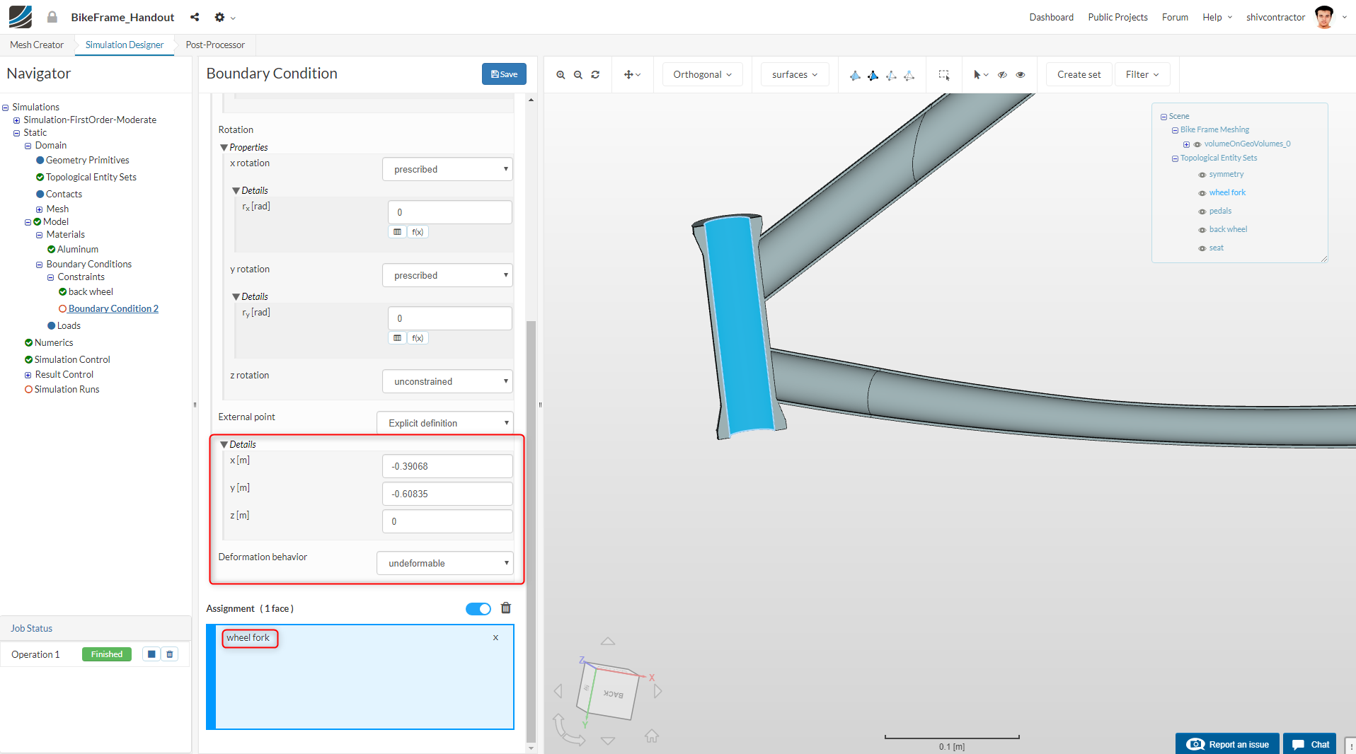 Assign the material to the entire bike frame (volume). To do this, click anywhere on the meshed geometry and highlight the material. Click Save to preserve the material settings.