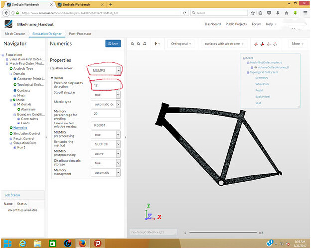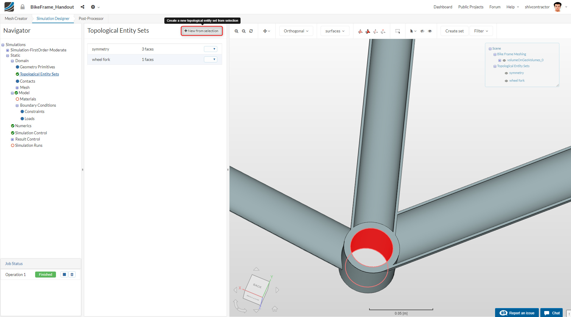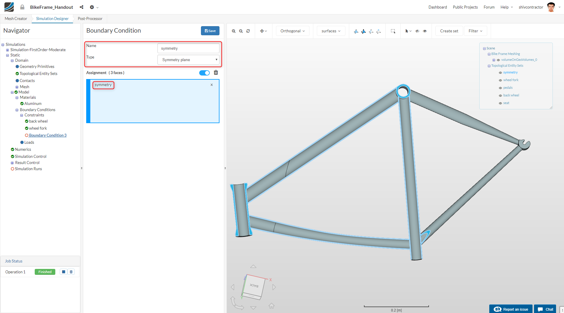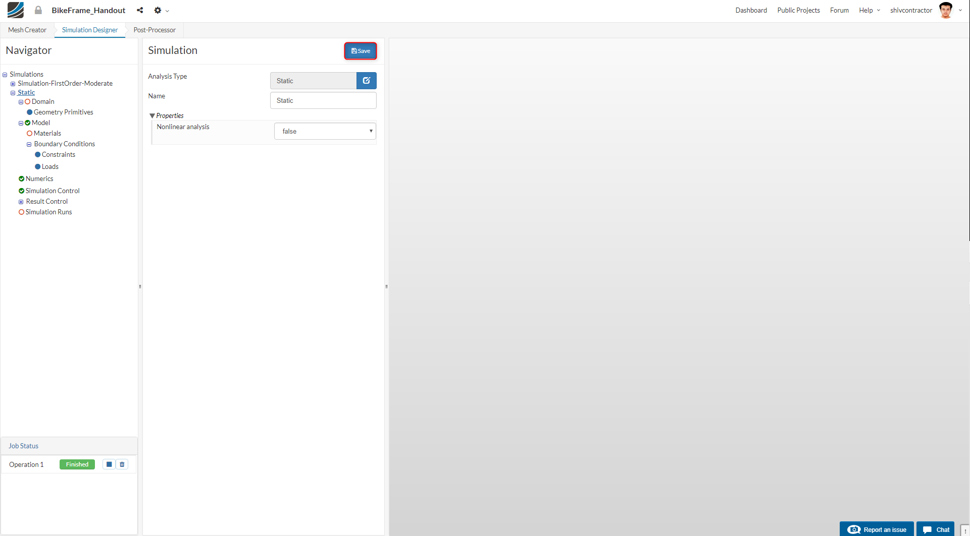 Assign the material to the entire bike frame (volume). To do this, click anywhere on the meshed geometry and highlight the material. Click Save to preserve the material settings.