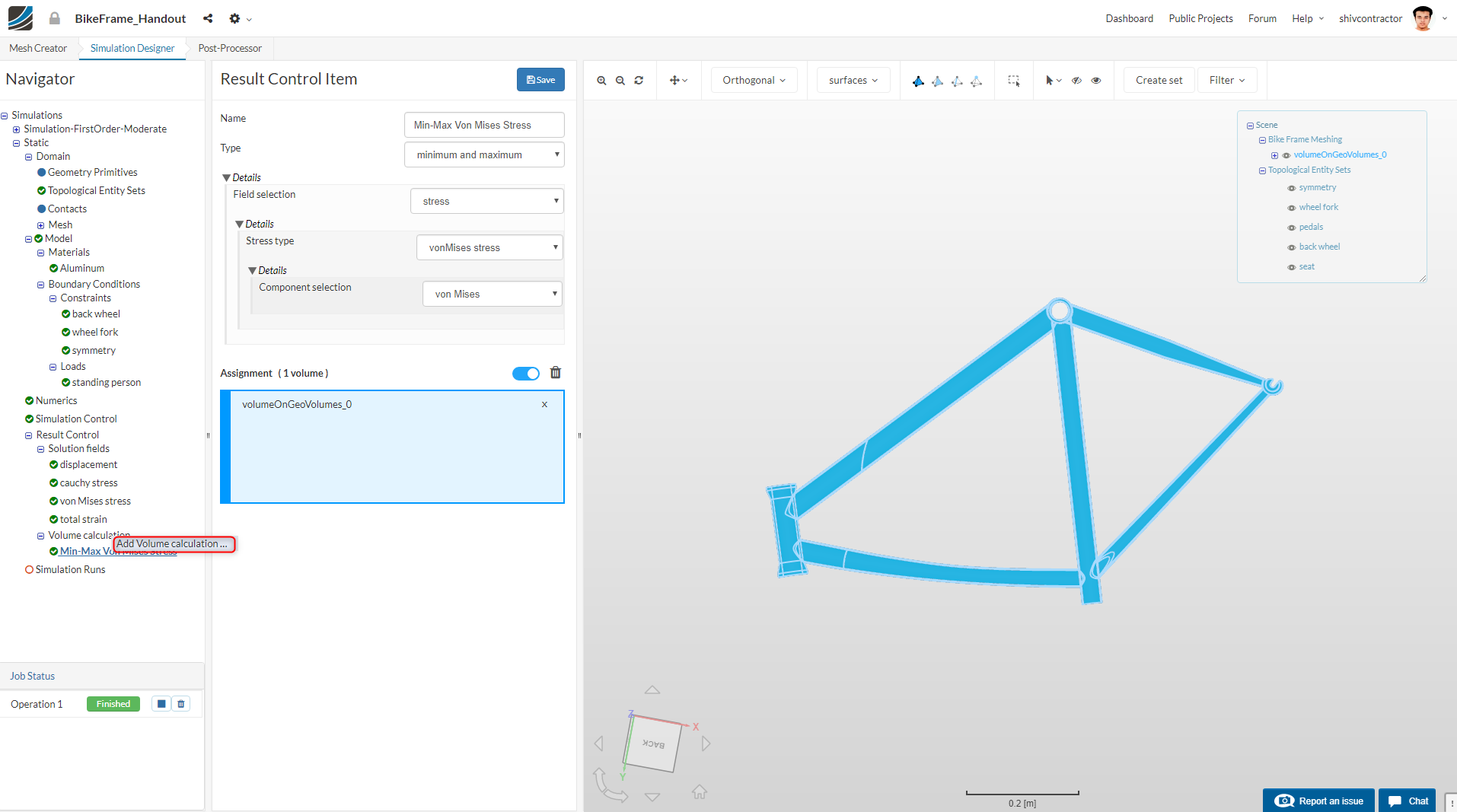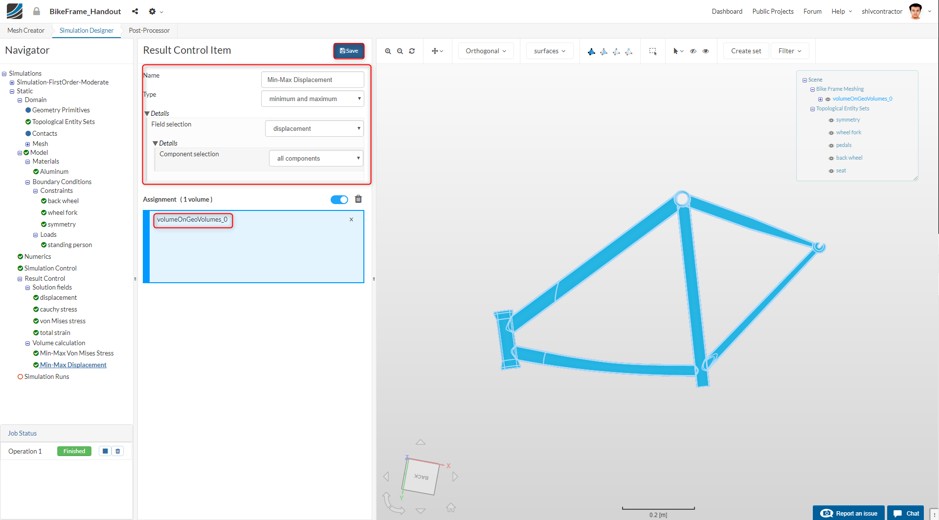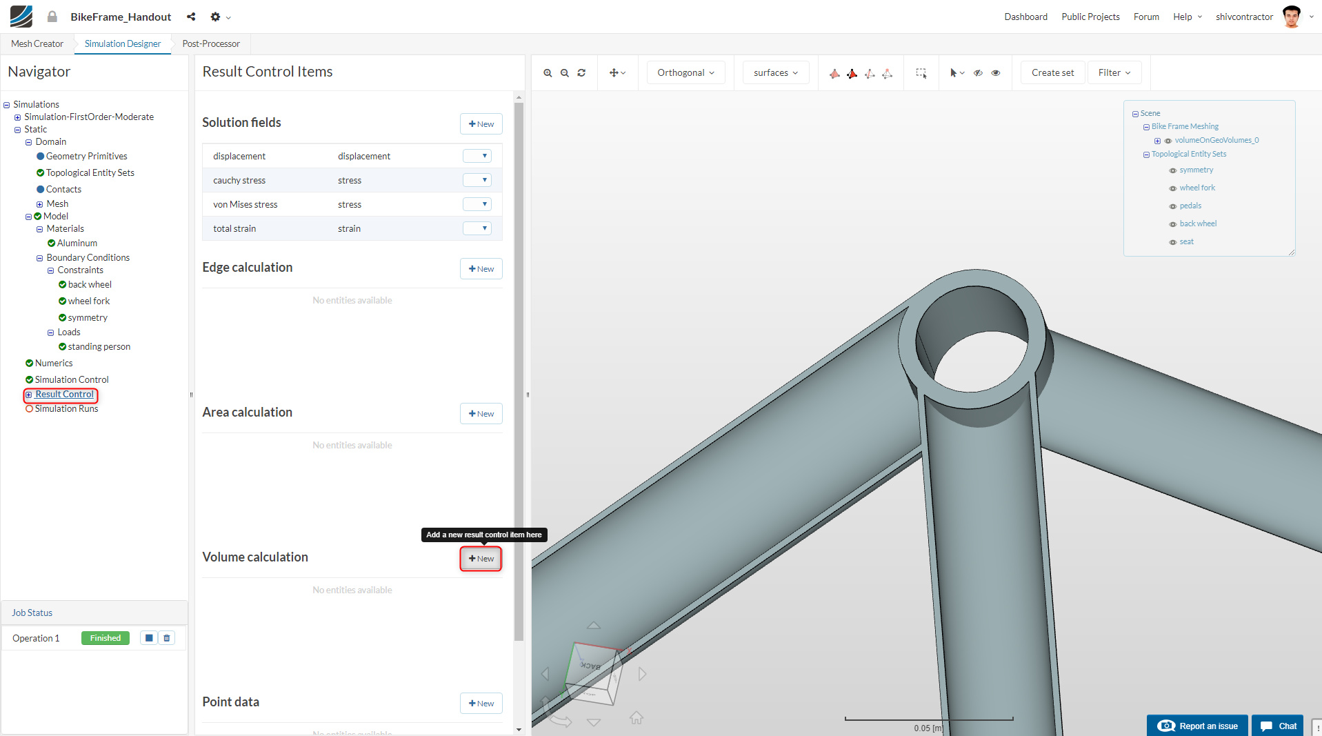 Further, we intend to analyze solution fields such as Max-Min von Mises Stress, Displacements and Strain over the entire volume of the bike frame. Hence, it is imperative to add result control items for the volume calculation.