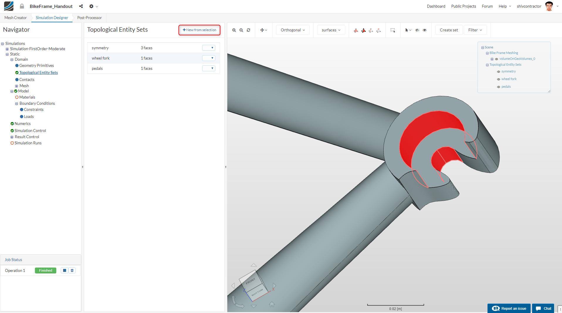 Please create the topological entity sets as shown. Here it is important to note that the topological entities are first to be selected in the viewer, followed by clicking on + New from selection.