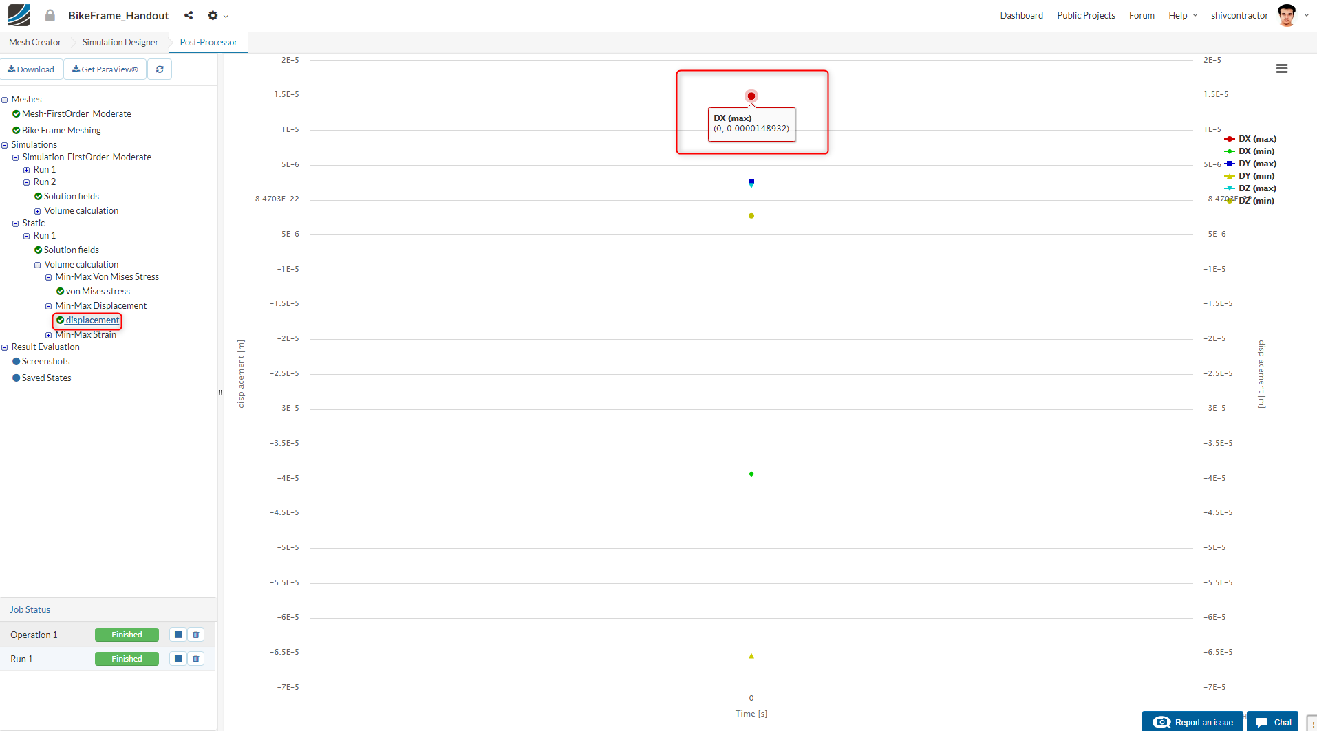 You may now compare the difference between the maximum stress and displacement values to the values from the provided simulation.