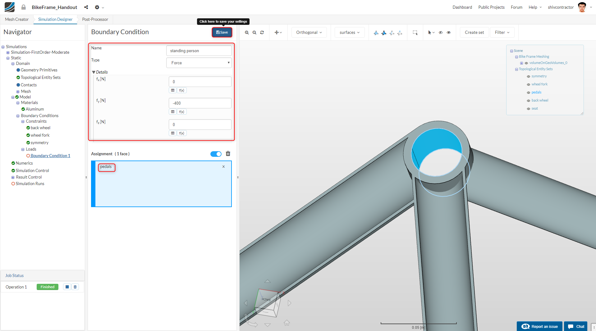 Follow the instructions as depicted in the image below. Set an appropriate name for the force, such as standing person. Assign a force of - 400 N in the y-direction. From the panel displayed on the top right of the viewer, you can choose which component this force acts upon. In our case, this should be the pedals.