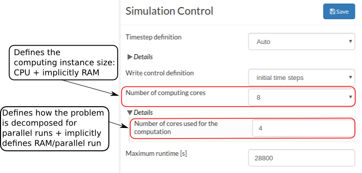 Every time you start a simulation run on SimScale a cloud computing instance with the specifications as defined under the “Number of computing cores” is fired up. It defines how many cores the instance has and implicitly also how much RAM is available, according to this table: SimScale Documentation | Online Simulation Software | SimScale