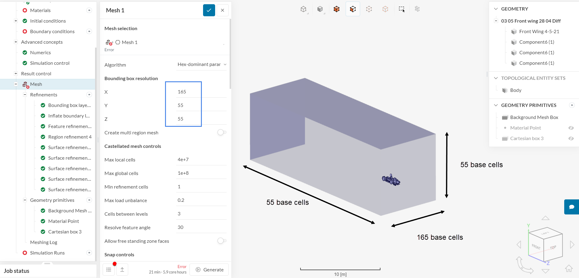 I am trying to simulate our front wing but I am getting an error message while meshing as: