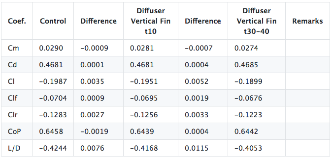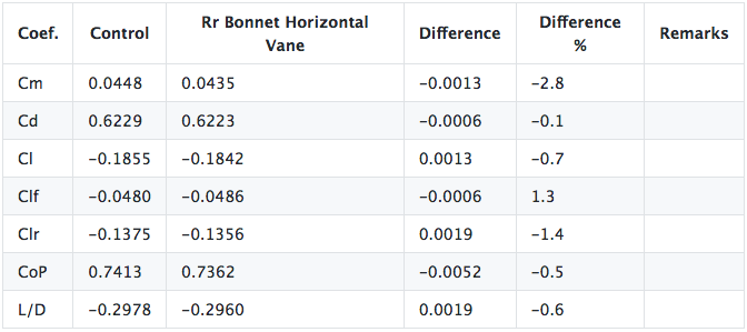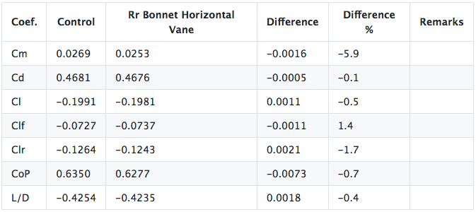 - ‘Rr Bonnet Horizontal Vane’ slightly increases front downforce and decreases rear downforce.