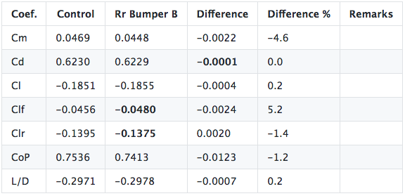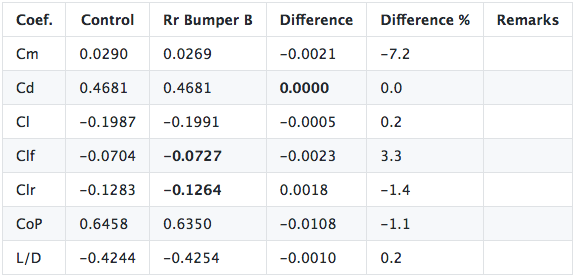 - ‘Rr Bumper B’ slightly increases front downforce and decreases rear downforce.