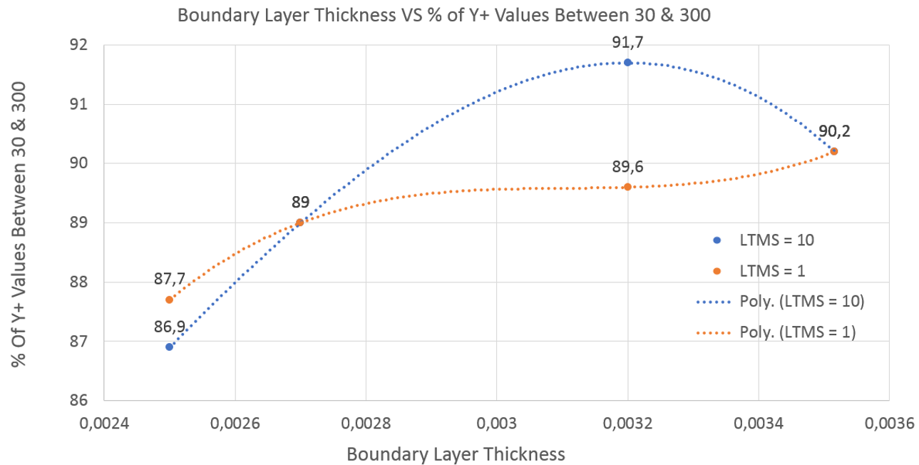 The second graph shows the Boundary Layer Thickness VS the percentage of Y+ values that landed between 30 and 300. This data also shows no trend between the different LTMS settings so further testing would be needed.