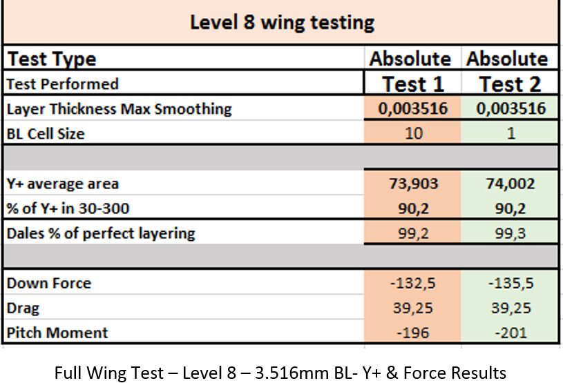 Once again, there was an increase in layer thickness percentage between a LTMS of 10 and 1 in the Level 8 full wing tests. However, in this set of runs, the main change in Y+ values was due to the different boundary layer cell thicknesses.