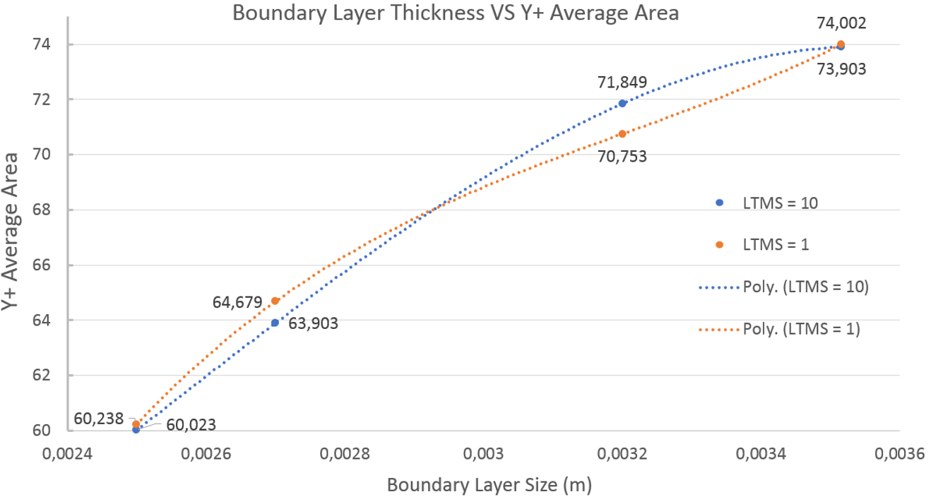 With these results added to the other boundary layer thickness tests, I have made a few graphs to compare these trends. The first graph shows the change in Y+ average area VS the chosen boundary layer cell size. The trend shows higher Y+ values using a LTMS of 1 for the 0,0025 and 0,0027m boundary layers before dipping down for the 0,0032m and finally rising again with the 0,003516m boundary layer cell size. The 0,0032m outlier could be caused by the small testing field or the low amount of iterations in the simulation.