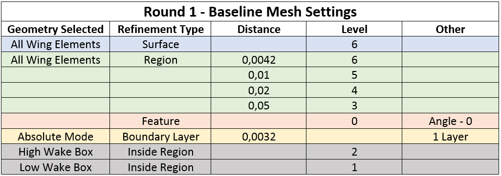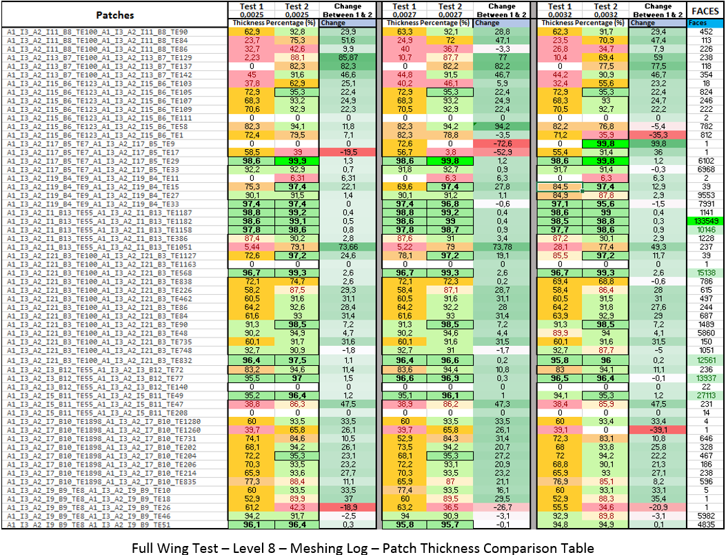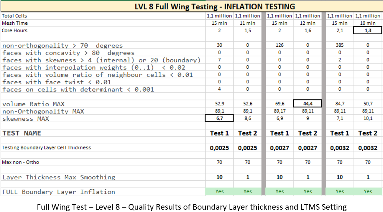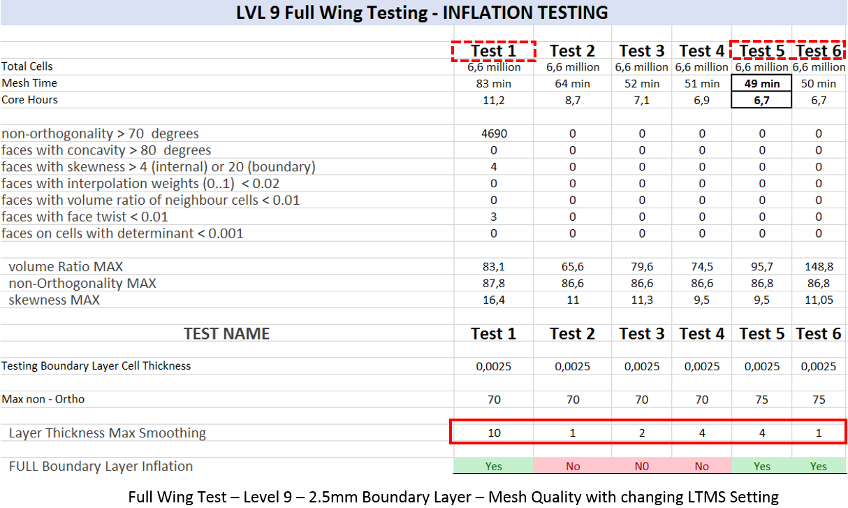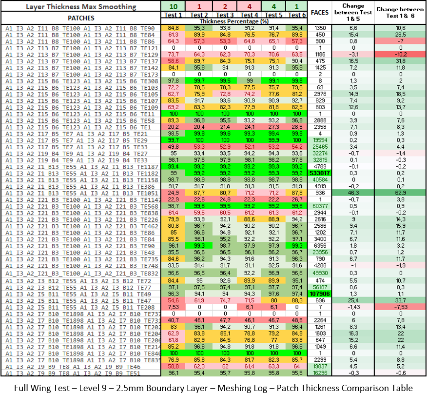 With the new setting found, testing was once again returned to the full wing geometry. Starting with the level 9 full wing, a comparison was made between the layer thickness percentage achieved and the Layer Thickness Max Smoothing (LTMS) setting. Test 1 is copied from the beginning of Round 6 testing and is the baseline for the improvement comparison. The first step was visually inspecting each test for full boundary layer inflation on the geometry surface. Test 2, 3, and 4 had layer deflation with Layer Thickness Max Smoothing set to 1 ,2, and 4 respectively. With this successive failure, Test 5 increased the Max non-orthogonal quality setting to 75, which resulted in the boundary layers returning.