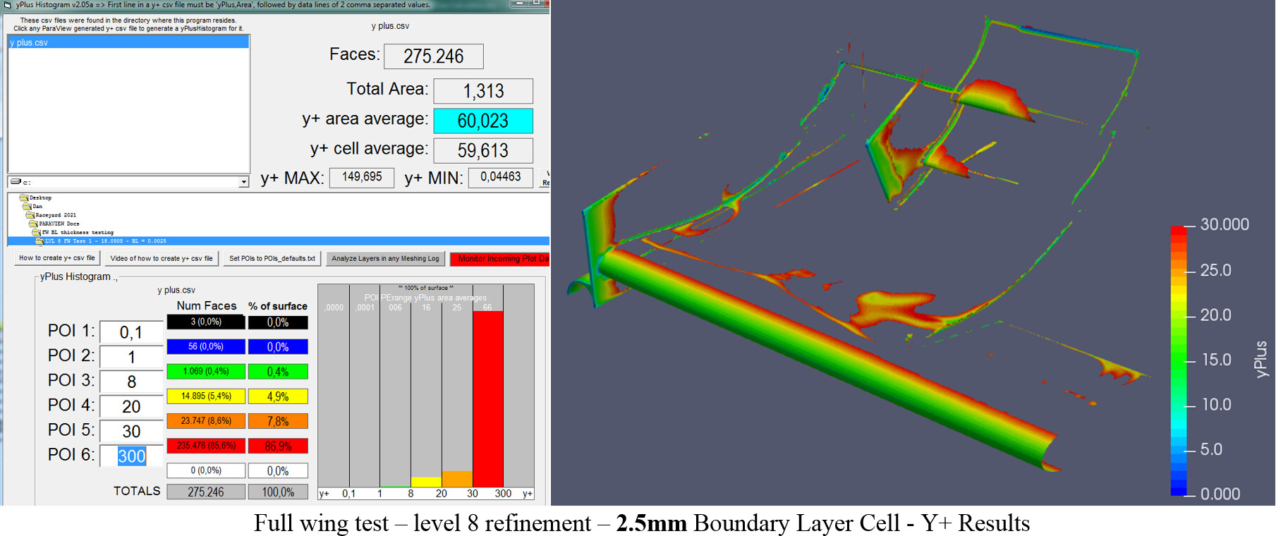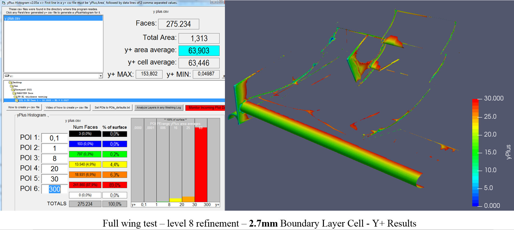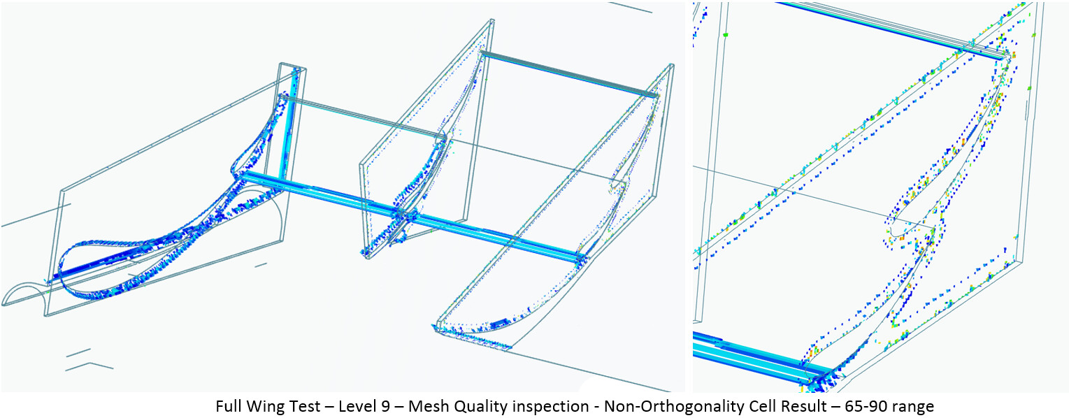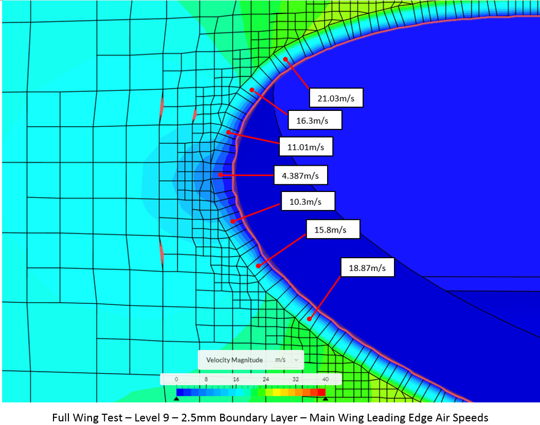 The next step is to move back into a full front wing test. Starting again using the best known results, a mesh with a 0.0026m cell size and 70deg max non-orthogonality, was created. However, these settings taken from the successful small section test in round 5 again resulted in layer deletion. This goes to show how small section testing success does not mean it will transfer to full scale. By reducing the Boundary layer further to 0.0025m, the layers came back and could be simulated for Y+ histogram calculation.