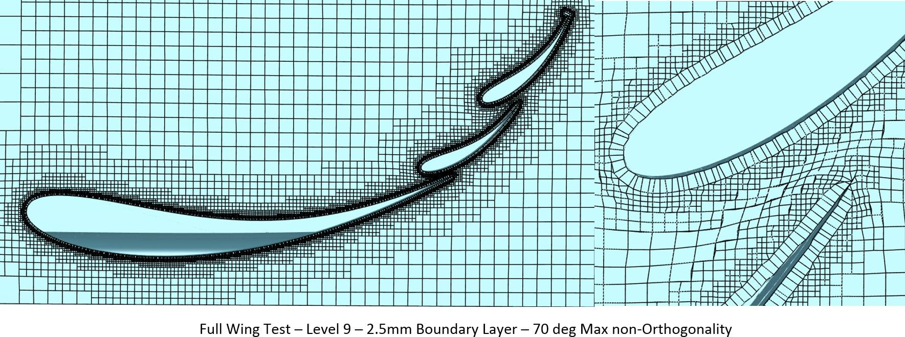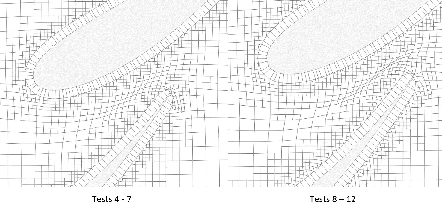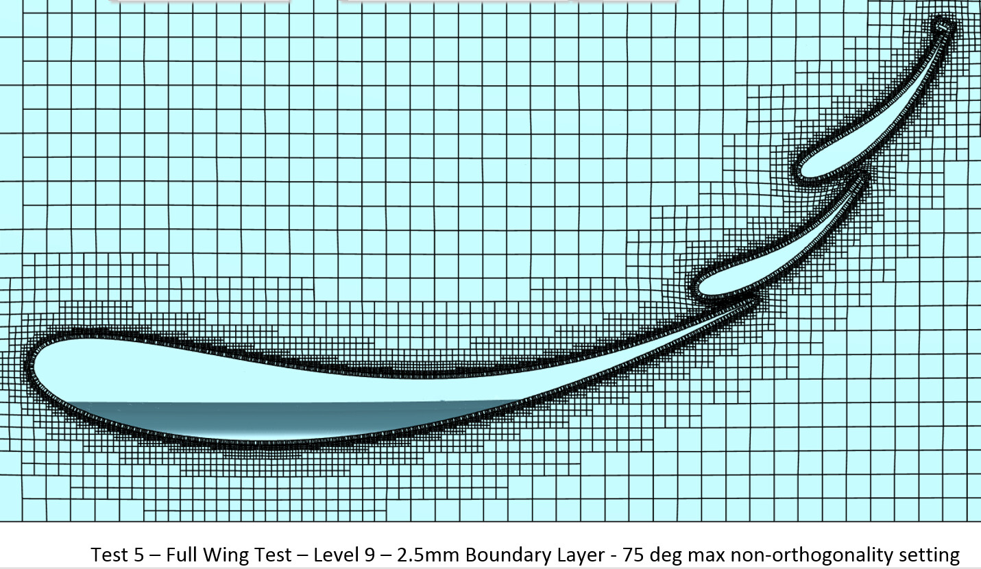 Along with the changes to boundary layer thickness percentage, there were also changes to the resulting mesh quality output. MAX volume ratio was reduced, skewness stayed about the same, yet MAX Non-orthogonality increased. This can be contributed to the layers regaining their thickness and pushing the hex cells further outward from the geometry. This is clearly seen below with the difference in cell squish between wing element cross section pictures for tests 4-7 compared to tests 8-12 shown below.