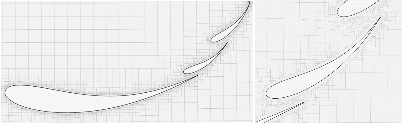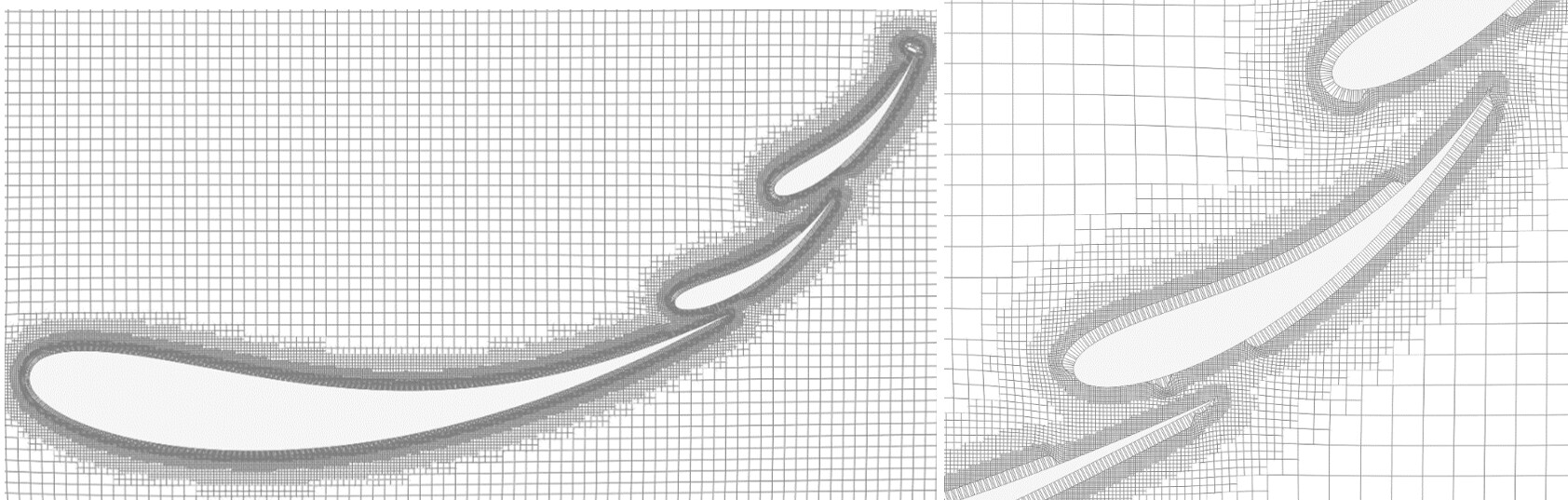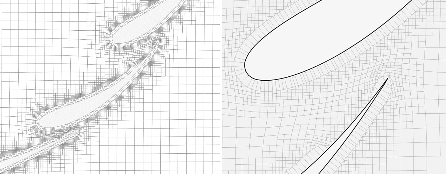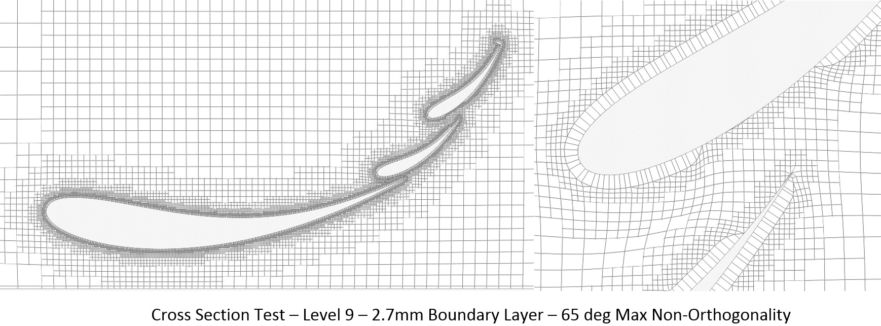 Along with the changes to boundary layer thickness percentage, there were also changes to the resulting mesh quality output. MAX volume ratio was reduced, skewness stayed about the same, yet MAX Non-orthogonality increased. This can be contributed to the layers regaining their thickness and pushing the hex cells further outward from the geometry. This is clearly seen below with the difference in cell squish between wing element cross section pictures for tests 4-7 compared to tests 8-12 shown below.