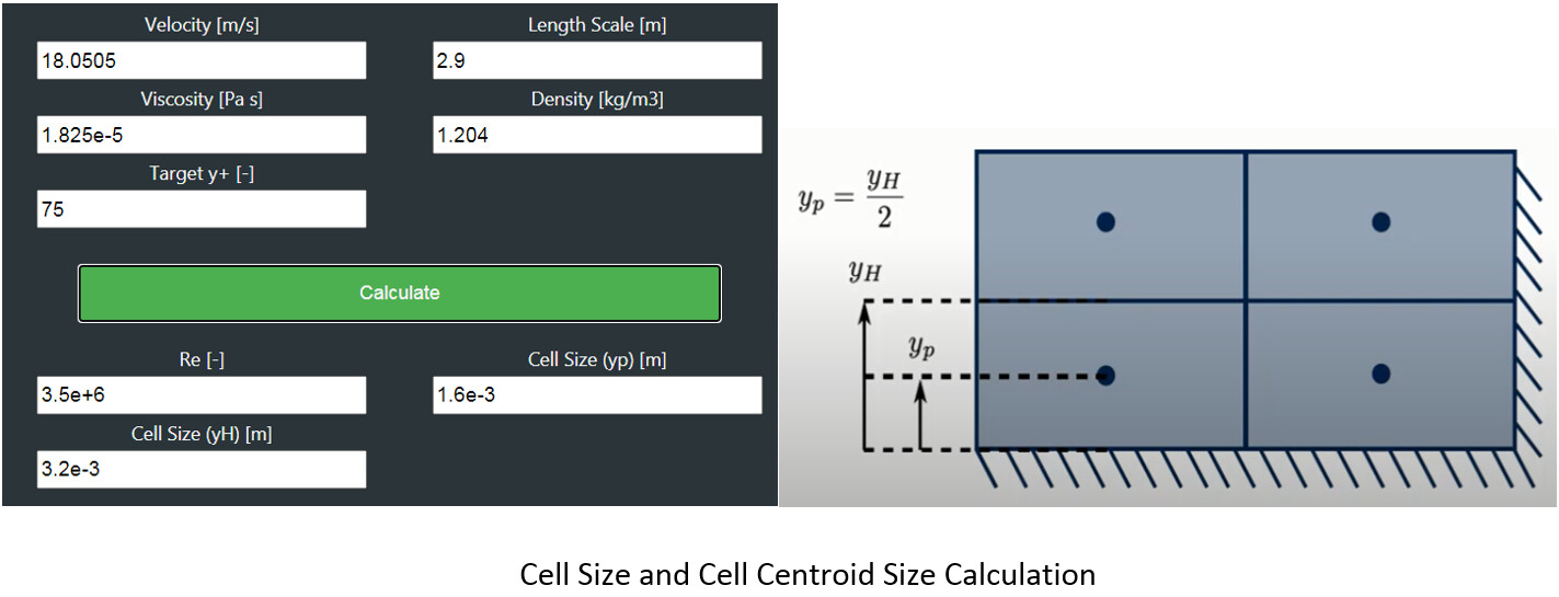 The first step is to use a Y+ calculator to get an initial estimate of the needed first cell size. It is very important at this point to understand that most calculators will output the CELL CENTROID SIZE . This means that the cell size used in the boundary layer refinement must be DOUBLED in order to get the Y+ value calculated. The absolute best description into finding initial Y+ values is from the Fluid Mechanics 101 Video here: https://www.youtube.com/watch?v=60fDz2cVdy8 by Aidan Wimshurst. If you are interested in learning CFD, his channel is a MUST. Using the following settings in his calculator we get an initial cell size (yH) of 0.0032m based off a desired Y+ of 75. The settings are based off of a sea level condition at 20° C.