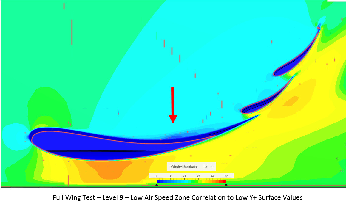 The visual Y+ surface results are extremely useful for determining if the simulation can be trusted. With verification that Y+ values are being represented in the correct locations on the wing, I continued testing different settings to try and find a way to increase the overall Y+ values. To do this, I looked into meshing the full wing with a max surface refinement of level 8 (0.001953m) as well. This is because the original goal of these tests was to increase cell fineness of the front wing to see if there was a large difference in force results (a mesh independence test). This project has now morphed into Y+ verification testing, yet is useful nonetheless.