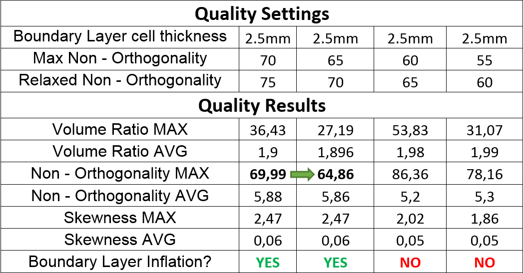 By increasing the Max Non- Orthogonality value to 70, layer inflation was once again present when combined with a 0.0026m thick cell size, producing acceptable quality results.