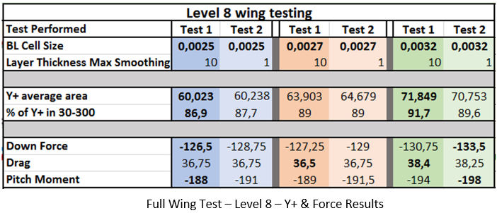 Without showing every single Histogram screenshot, I have summarized the three test results into the Y+ average area and percentage of Y+ values within 30-300. Additionally, I have added some force and moment results to show the influence that Y+ values can have on force accuracy. For the level 9 testing, even with the increased boundary layer thickness percentages, the Y+ values from the Histogram show no change. The force results are also fairly similar, other than the pitching moment difference between Test 1 and 6.