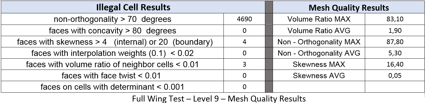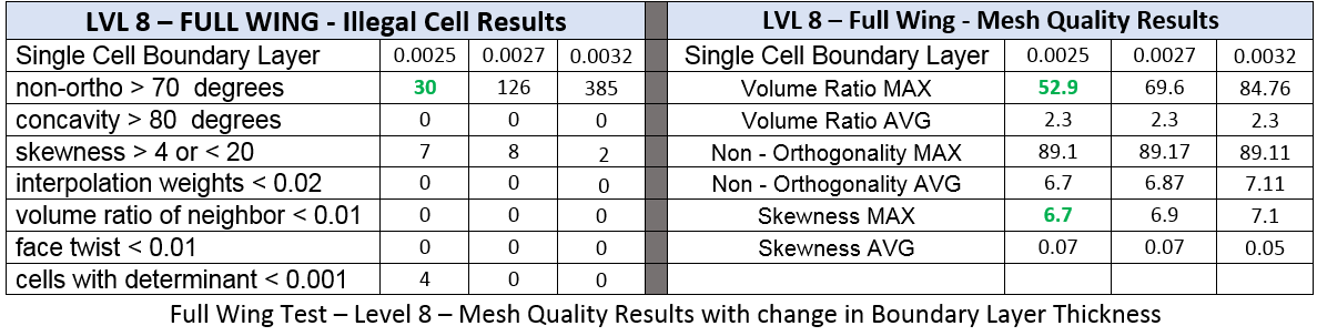 Continuing the testing on the Level 8 full wing geometry, results were fairly similar. This time however, different boundary layer thickness refinements were used to compare not only the effect of the LTMS setting, but also the size of the single cell layer. Boundary layer sizes were tested at 0.0025, 0.0027, and 0.0032m and were ran twice with LTMS at 10 and 1. For the 0.0027 and 0.0032m BL runs, the MAX volume ratio was reduced, for all three tests, MAX non-Ortho stayed the same, MAX skewness increased, and the total illegal cell count was reduced.