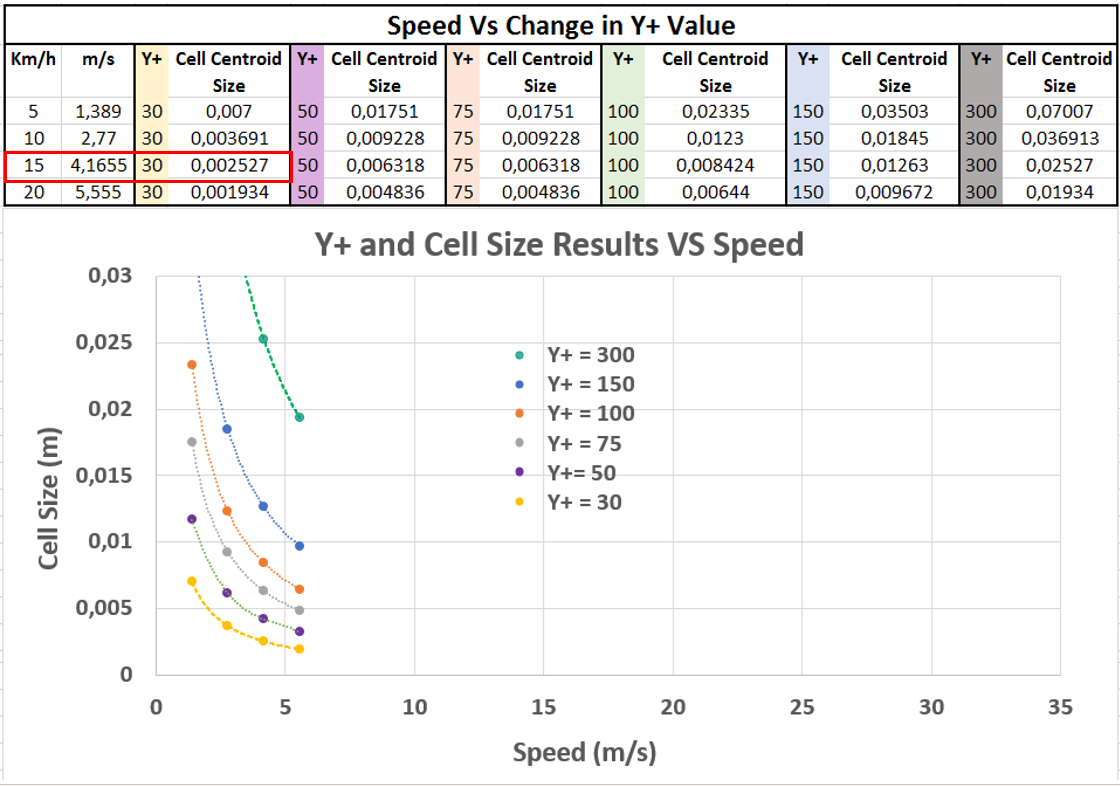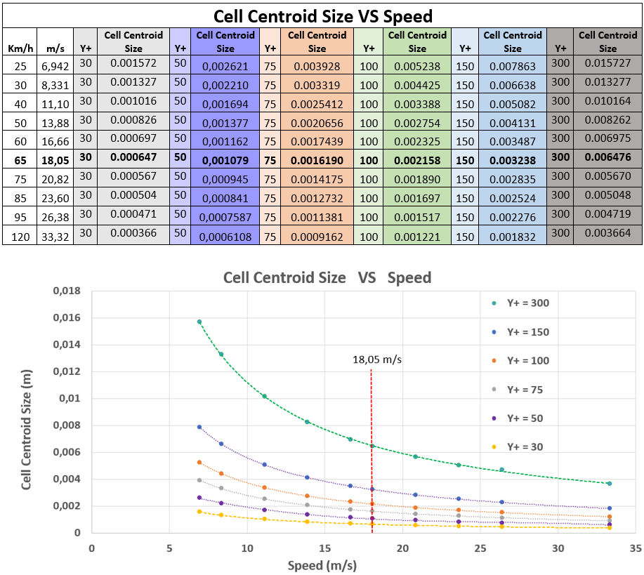 It can be seen that for a certain speed, there will be a range of cell centroid sizes that will produce an acceptable Y+ average value over the geometry. This is an advantage during meshing because it allows for some modification of the first cell thickness in order to better inflate the boundary layers.