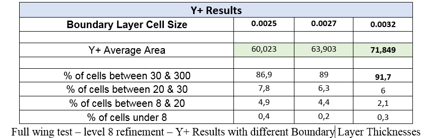 All three boundary layer sizes achieved full layer inflation when inspecting the mesh. It can be seen that the 0.0032m thick BL has the highest Y+ average area and percent of Y+ values in the 30-300 region. Looking at the Y+ surface results for the 0,0032m boundary layer cell, there is clearly an increase in Y+ on the main wing leading edge, as well as other locations throughout the geometry. This result makes it seem that the largest initial boundary layer cell size the better. However, the first section of this article portrayed how difficult it can be to even get full boundary layer inflation on the geometry. For full layer inflation, a thinner boundary layer cell size has clear advantages, in terms of success rate and reduce illegal cell count. Therefore, the balance between these two factors is important, yet once again, is up to you to decide where the line is.