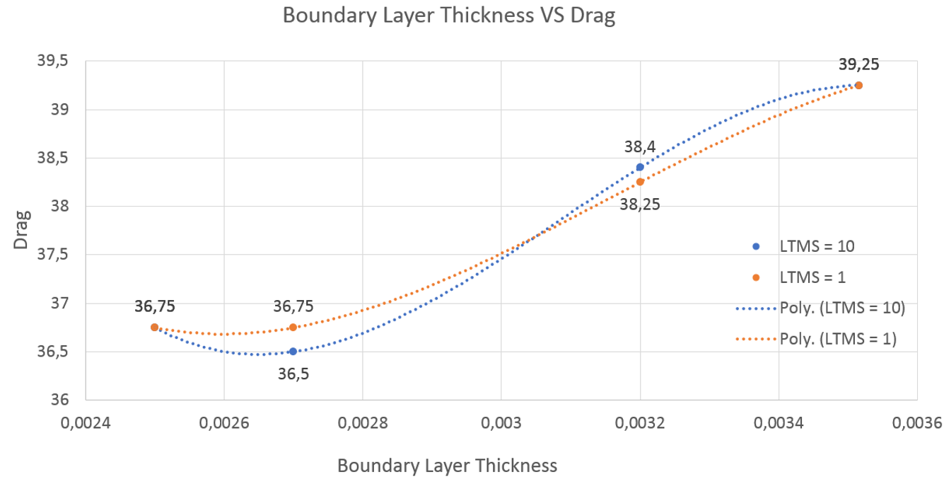 For Drag, the results are not so conclusive. The Thinner Boundary layer runs showed slightly more drag before transitioning to slightly less drag for the 0,0032m run. However, since the difference between results are so similar, it is difficult to verify a trend. For such close data points, it would again be necessary to run multiple simulations with a longer write interval and use a highly accurate data recording point from the force results graph. Therefore, I would conclude that the drag force results do not change based on the LTMS setting. However, just as with the Downforce results, Drag also shows an increase as the boundary layer thickness increases.