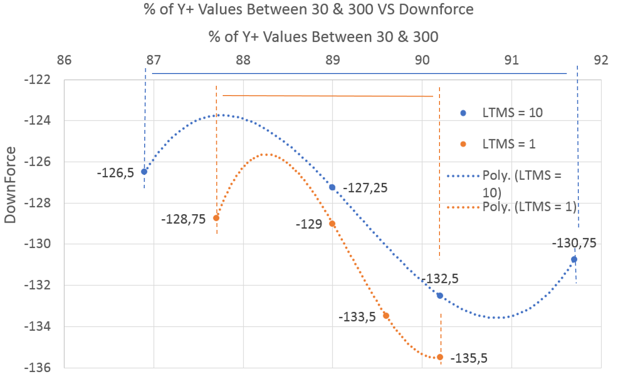 Finally, another interesting graph comes from the percentage of Y+ values between 30 and 300 VS the total Downforce results. The increase of total downforce using the LTMS setting of 1 has already been shown, however, with this comparison, the range of Y+ values can be better observed between the two tests. With a LTMS of 1, the range is much smaller (87,7 to 90,2) = a 2,5% difference compared with a LTMS of 10 which has a range of (86,9 to 91,7) = a 4,8% difference.