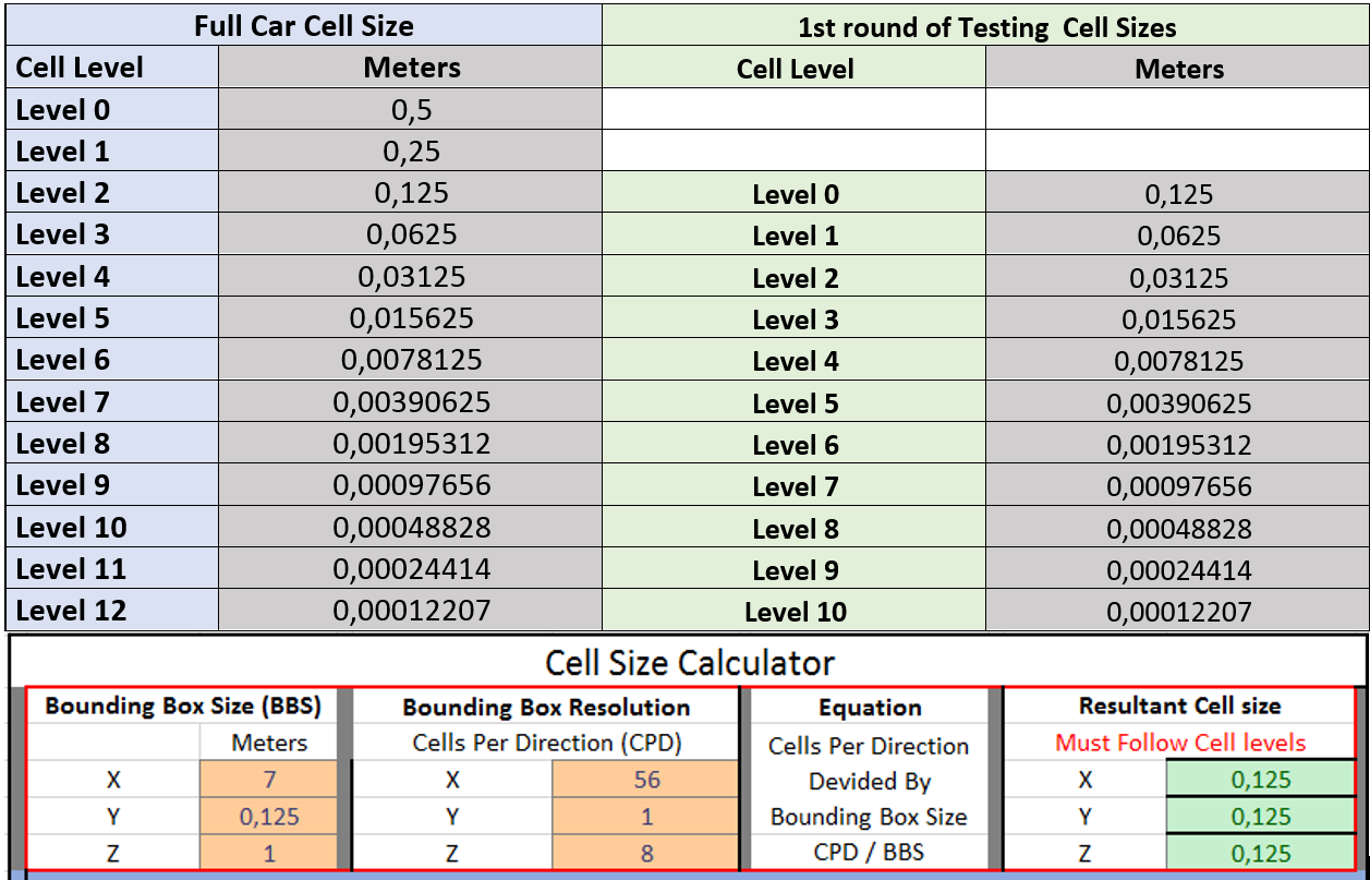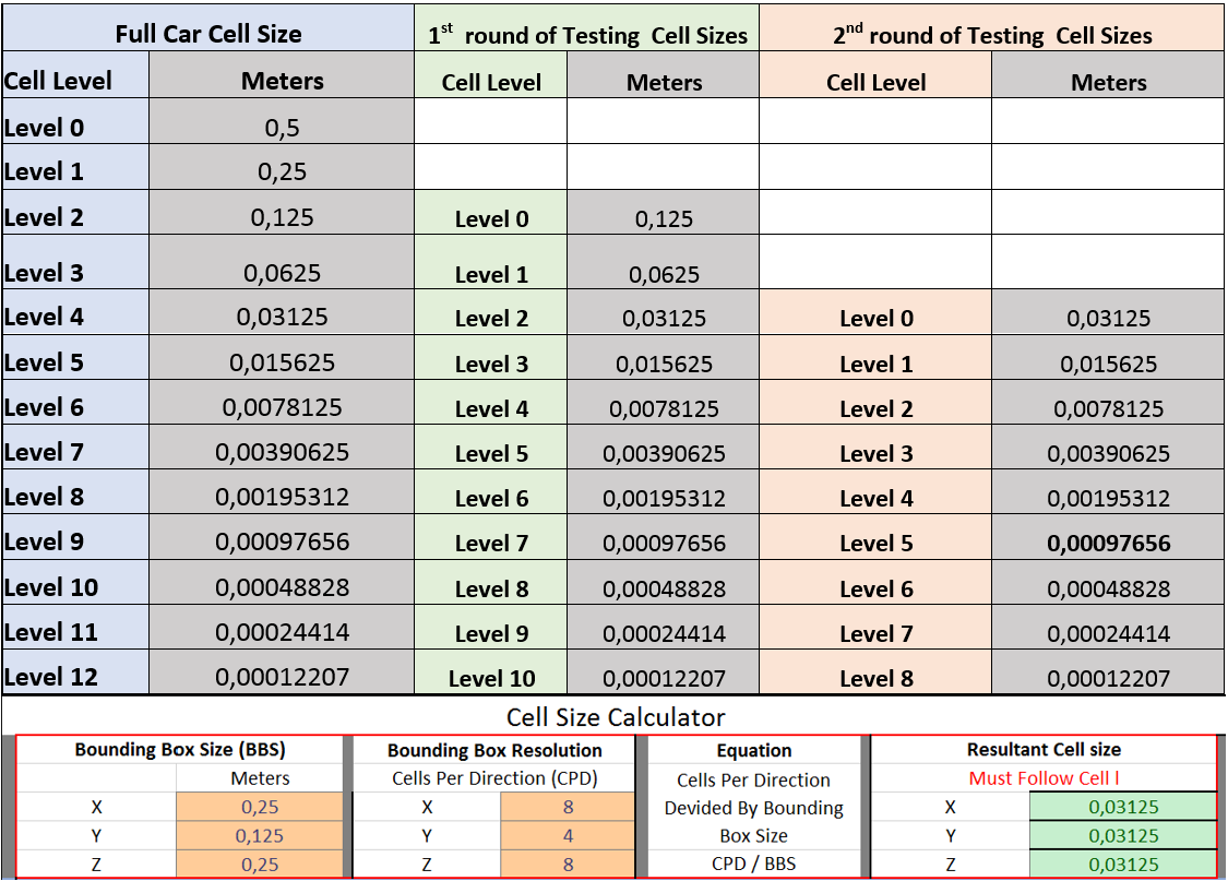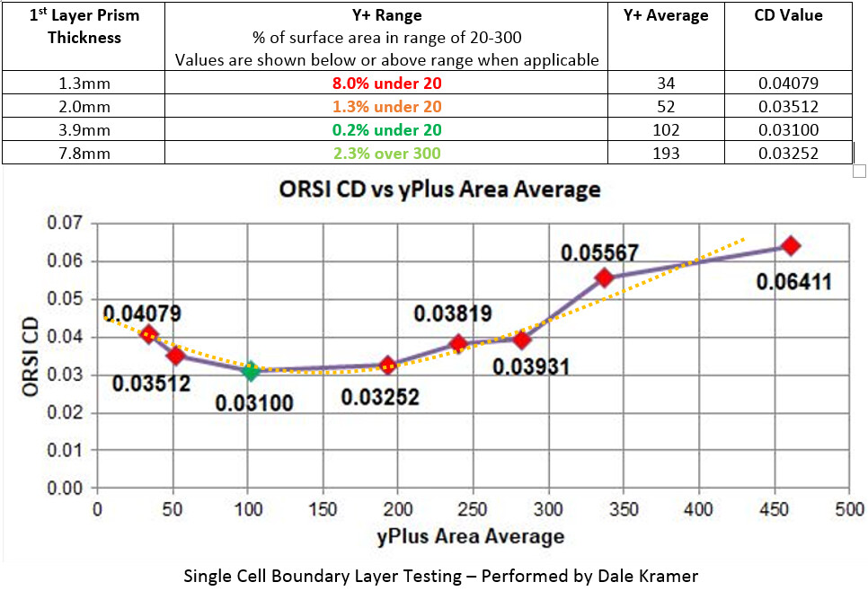 Using this data, it is clear that the optimal range seems to be between Y+ average area values of 50 to 200. This means that there will be a range of cell thicknesses that will be acceptable for use and will allow a modification of the first cell size in order to solve the layer deflation problem described in the first section. Up until this point, I have only used 3.2mm as my boundary layer thickness for almost all of my FULL CAR simulations, as layer deflation was never a problem in combination with a level 8 - (0,001953m) surface refinement cell size. However, the layer deflation problem started with the level 9 – (0,0009765m) local cell size described above. Now I believe that the single cell thickness can be optimized to further improve mesh and simulation quality. The next set of tests were then conducted to verify the reduction of the single cell thickness for useable Y+ values and to investigate the effect on quality results.