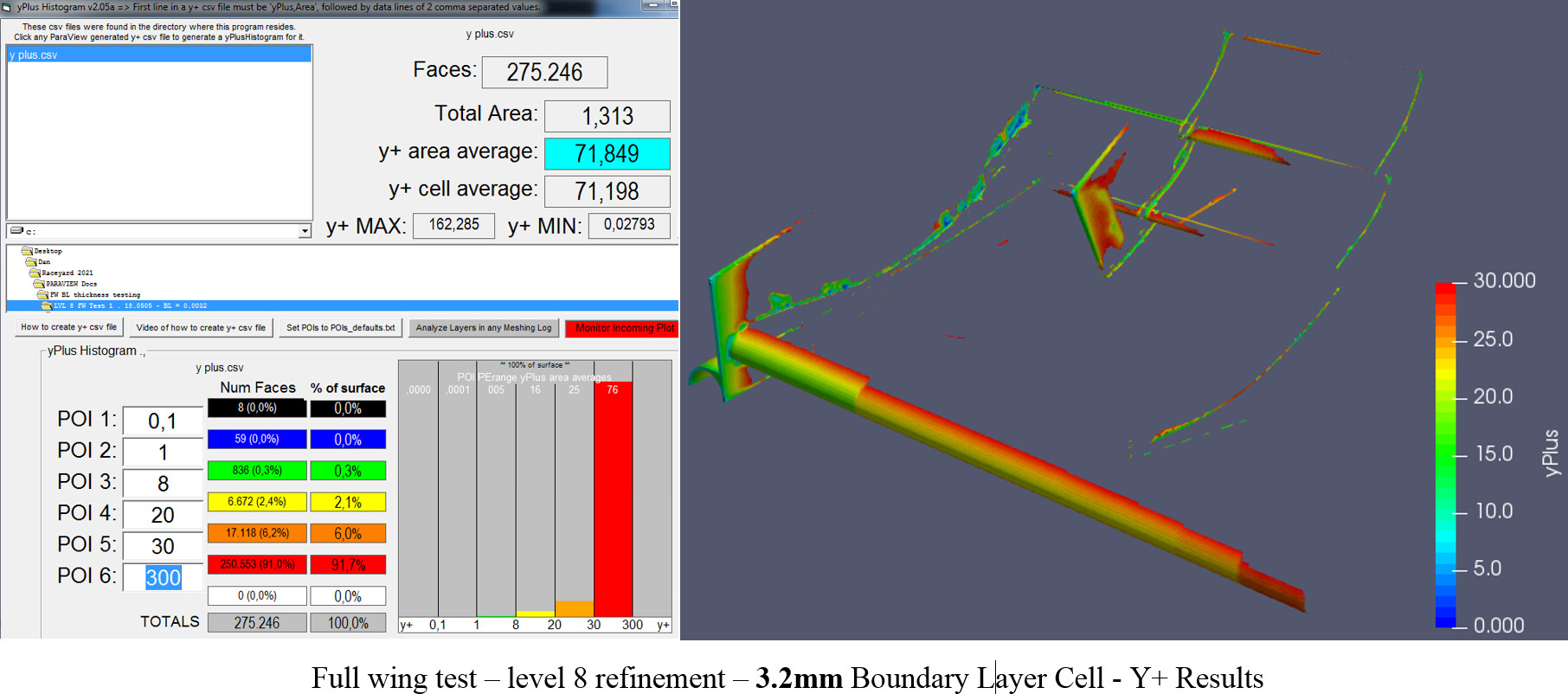 Looking at the Y+ results, the goal is to achieve some Y+ value improvement as all three tests have a decent amount of cells below 30. Only the 0.0032m cell size was able to achieve over 90% of cells in the log-law region. This can be contributed to the thicker boundary layer size being able to remove some of the lower Y+ values around the leading edge of the wing. The thicker cell centroid (0,0016m) can now measure speeds as low as 6-7 m/s, and keep the Y+ over 30. In contrast the 0,0025m boundary layer cell (0,00125m cell centroid) cannot measure speeds this low without the Y+ falling below 30. The limit for this boundary layer cell size is around 8,5 – 10 m/s, meaning the air speed must be above this threshold for Y+ surface results to show values over 30. Looking at the Y+ surface data, in addition to the Histogram results confirms this.