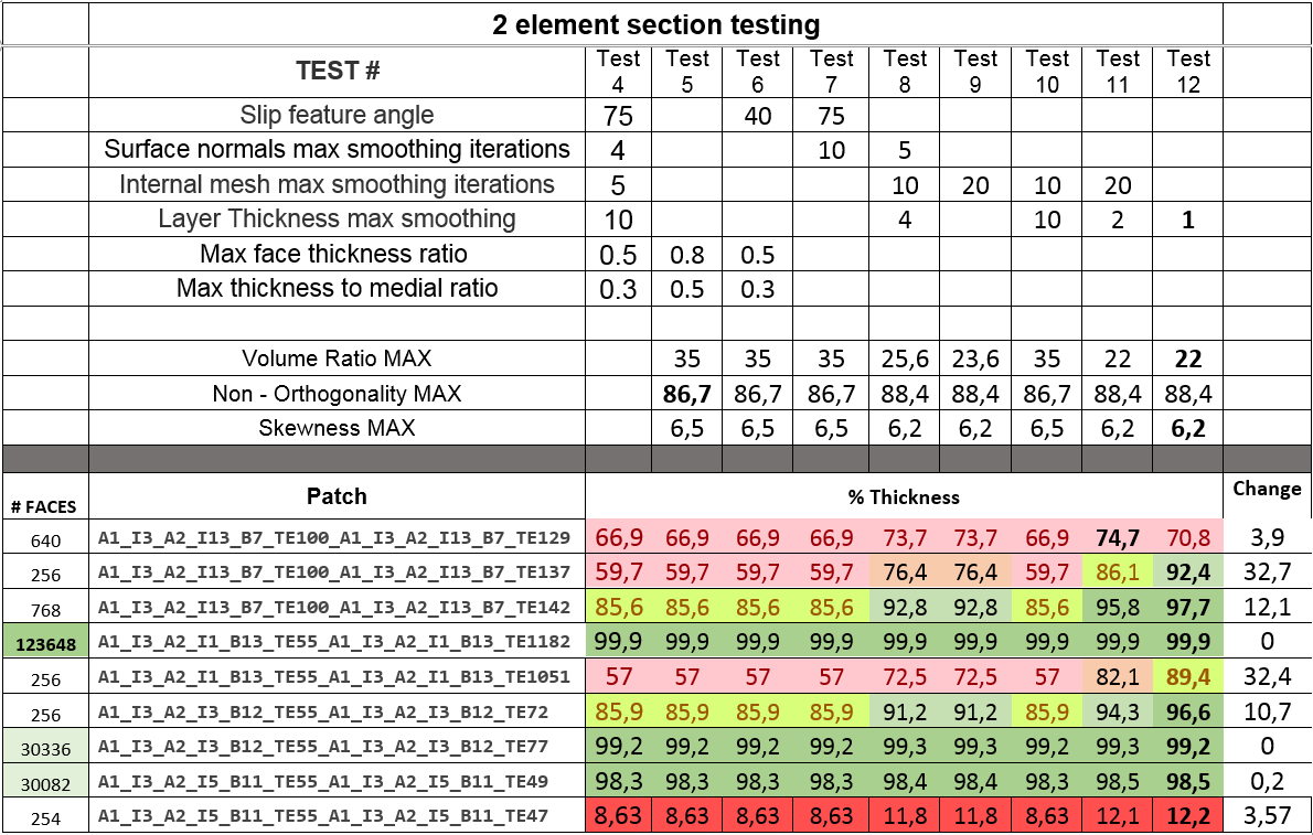 In search of further improvement to layer thickness, I decided to go back to the 2 element cross section test for quick turnaround times and played with some of the layer addition settings until a good solution was found. The changes shown below to these settings in tests 4 - 7 had little effect on layer thickness. Then in test 8, the setting: Layer Thickness Max Smoothing (LTMS) was reduced, which had a very large effect on the end result. With Layer Thickness Max Smoothing set to 1, the section test had the best values, with almost all patches achieving over 90% inflation. For this improvement interpretation, it is important to remember that the amount of faces in the patch can be seen as the determining factor for how critical it is that layers are close to 100% inflated. If there is a low percentage of inflation over a large amount of faces, then the Y+ value will be greatly affected. However, if there is a low inflation percentage over only a few faces, then this can be mainly ignored.