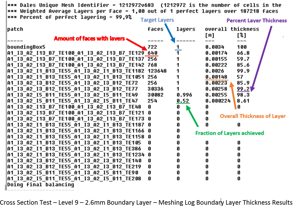 For the run above, it can be seen in the end of the meshing log that the layering results are not optimal. This output shows: