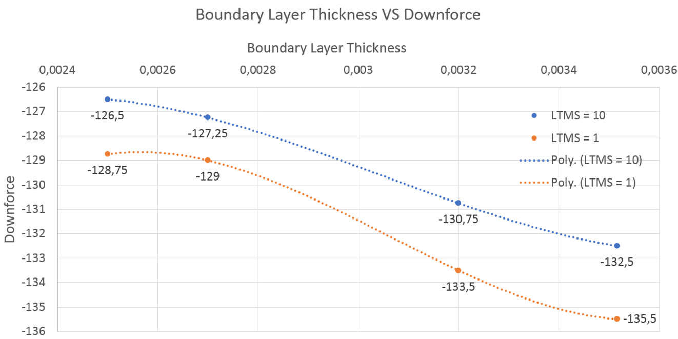 The next graph shows the Boundary Layer thickness results VS Downforce and then Drag. For the Downforce results, there is a clear trend. Downforce increased with an increasing boundary layer thickness and also with the lower LTMS setting of 1.