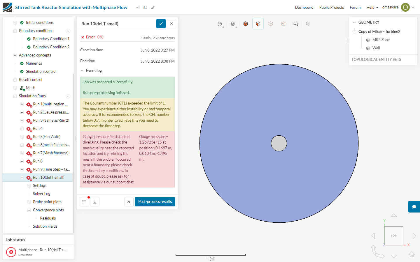 Gauge pressure field started diverging. Please check the mesh quality near the reported location and try refining the mesh. If the problem occured near a boundary, please check the boundary conditions. In case of doubt, please ask for assistance via our support chat.