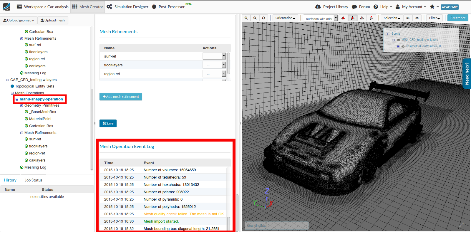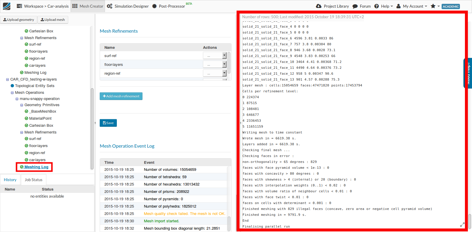 that the CAD model is not sufficiently prepared for meshing/simulation could be the reason, but it doesn’t have to. Did you already check why the meshing fails? There are two main places where you can check on the mesher’s progress. The first one should always be the Mesh Operation Event Log that summarizes the execution of the meshing operation and highlights potential problems.
