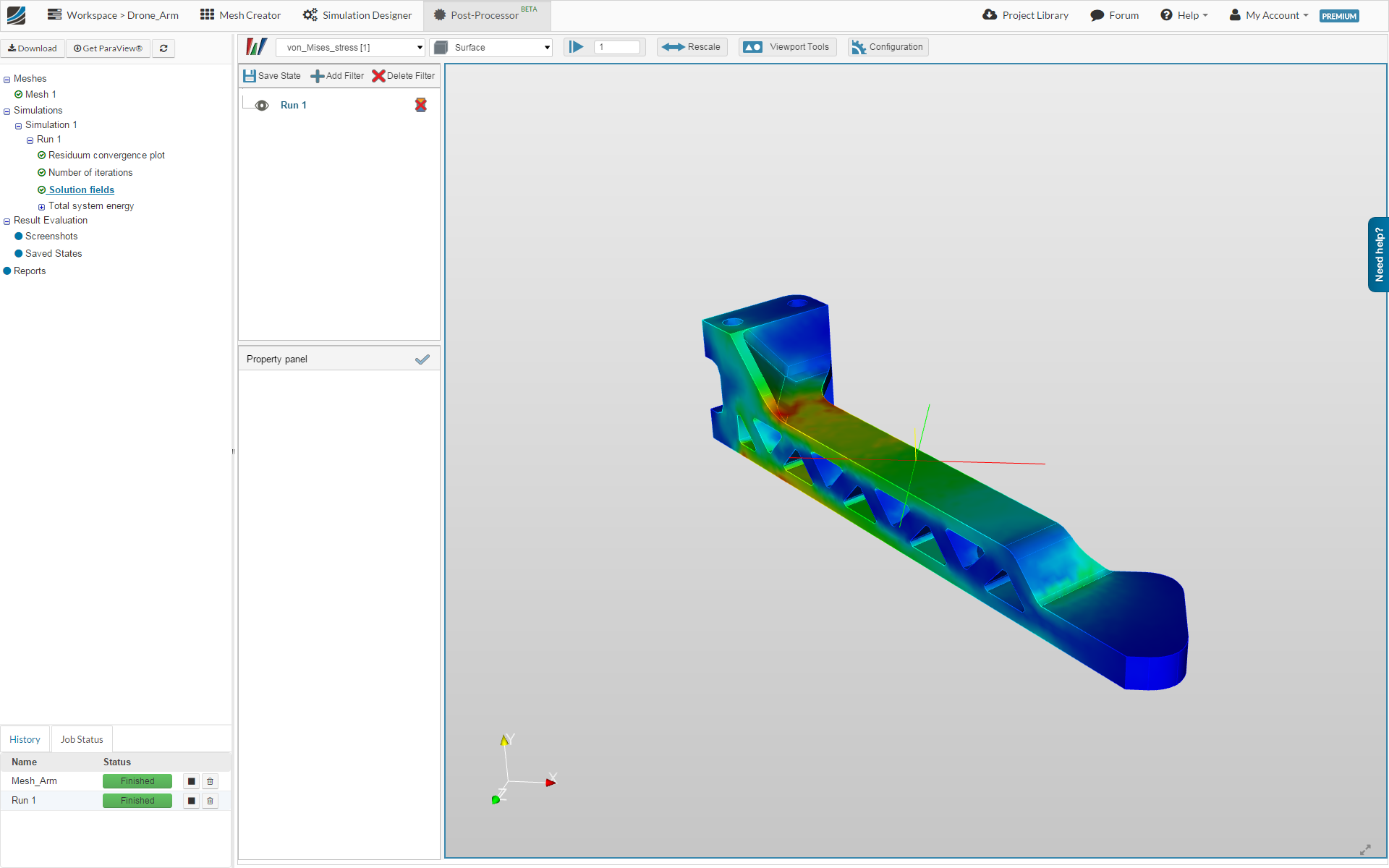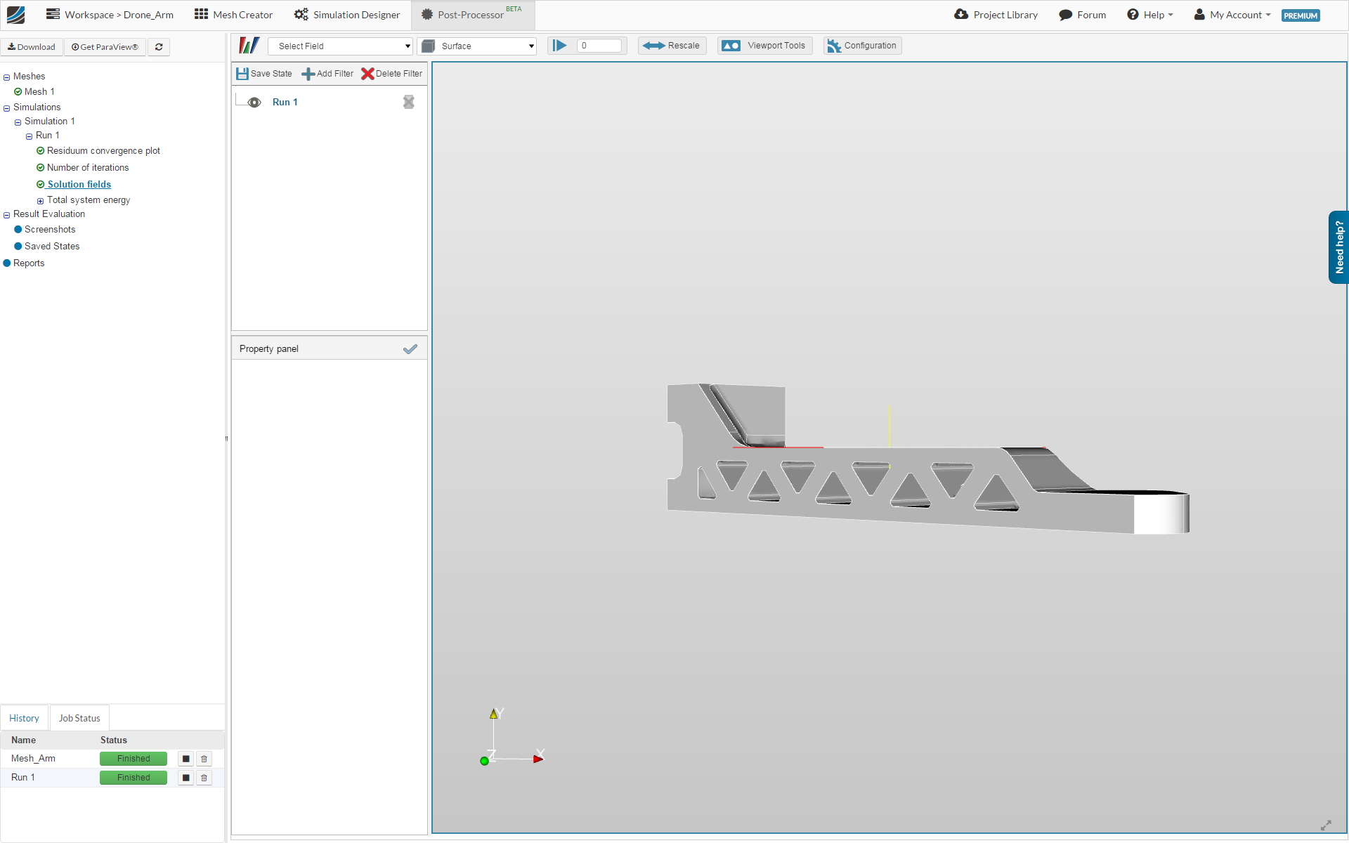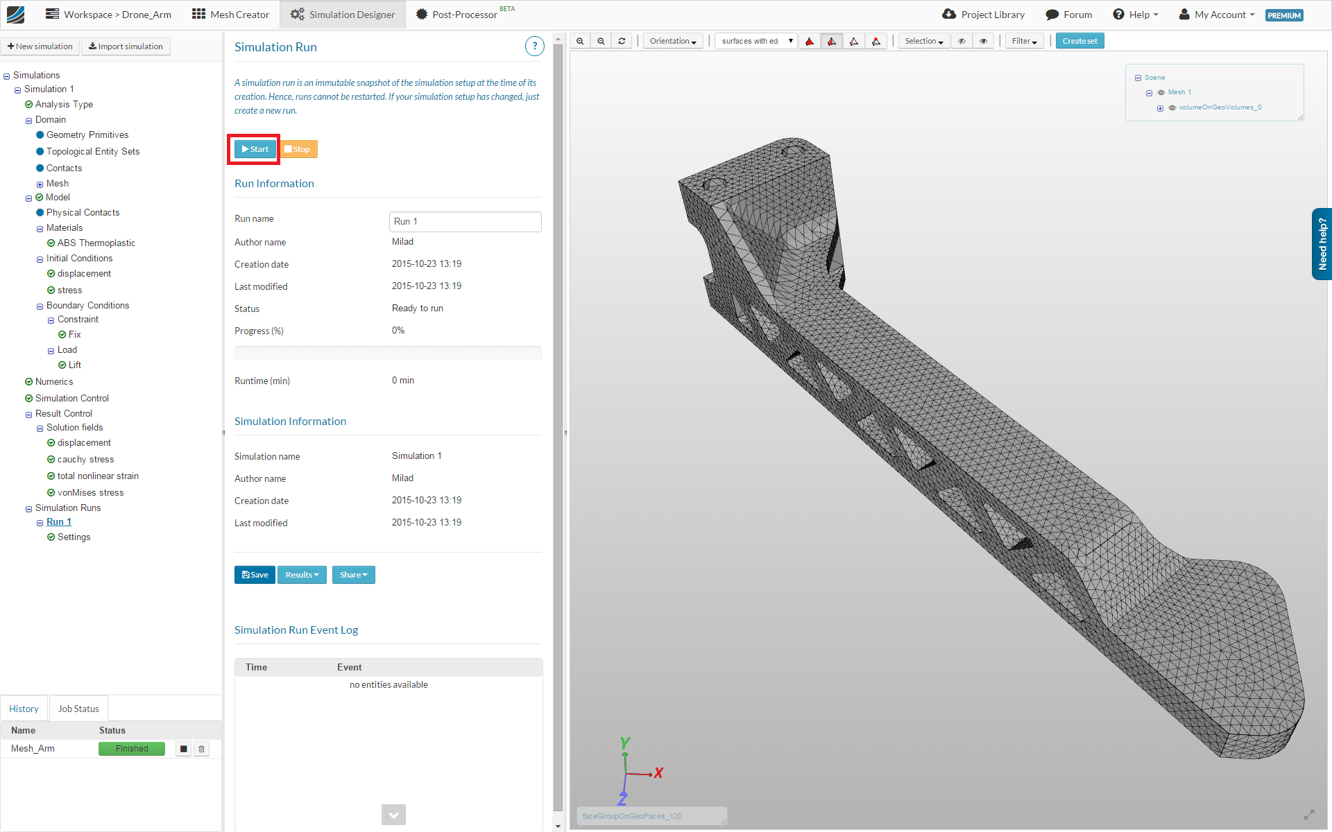 Unser Ziel ist es die Verformung einer Quadrocopter-Armes für verschiedene Auftriebskräfte zu untersuchen. Hierzu werden wir ein Rechengitter (Netz) für den Arm erstellen und dessen strukturelles Verhalten für verschiedene Kräfte untersuchen (0.75N, 1.5N, 2.25N, 3N)