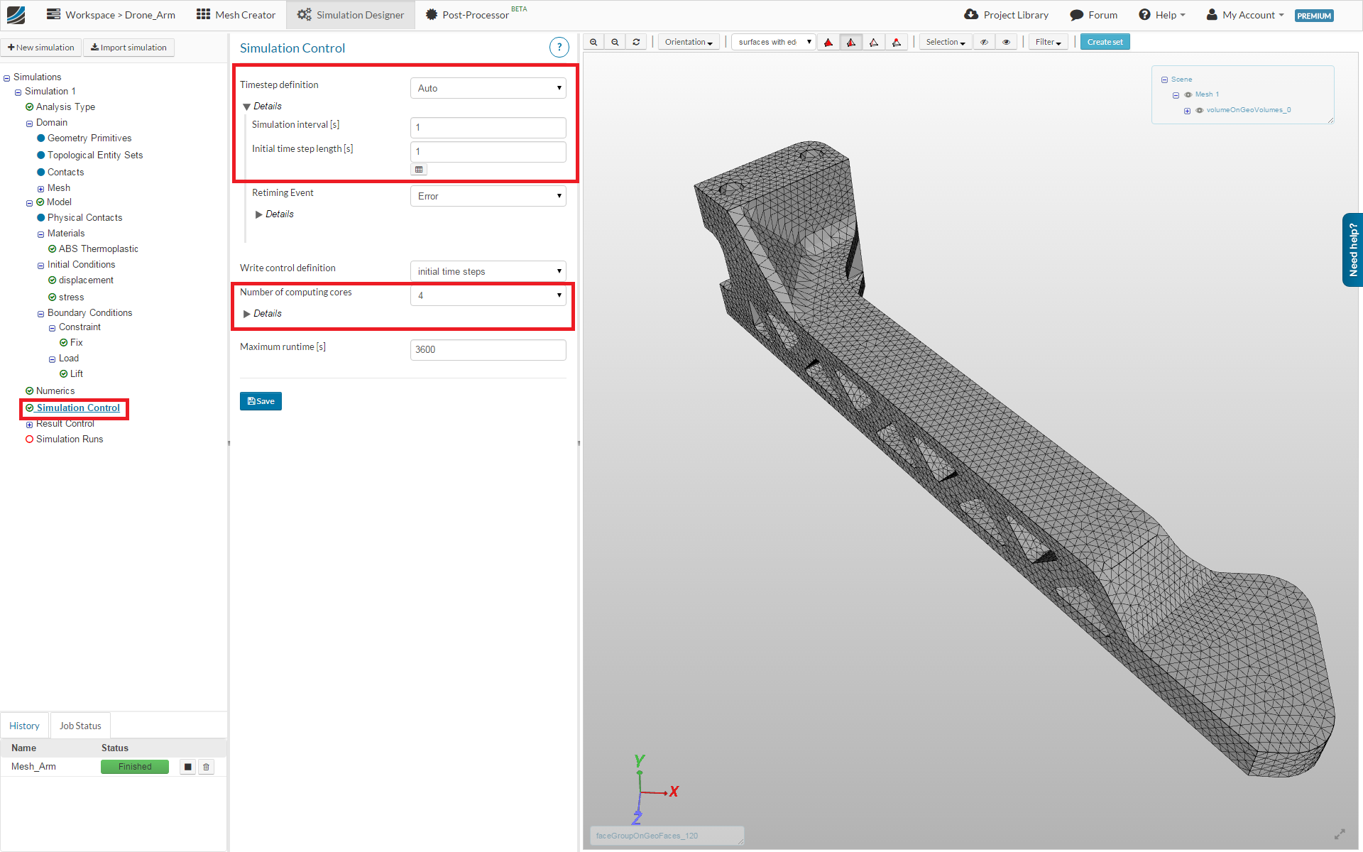Klicke nun auf das Simulation Control Element im *Projet Tree um die Geschwindigkeit und Genauigkeit der Simulation einzustellen. Bitte passe folgende Voreinstellungen an: