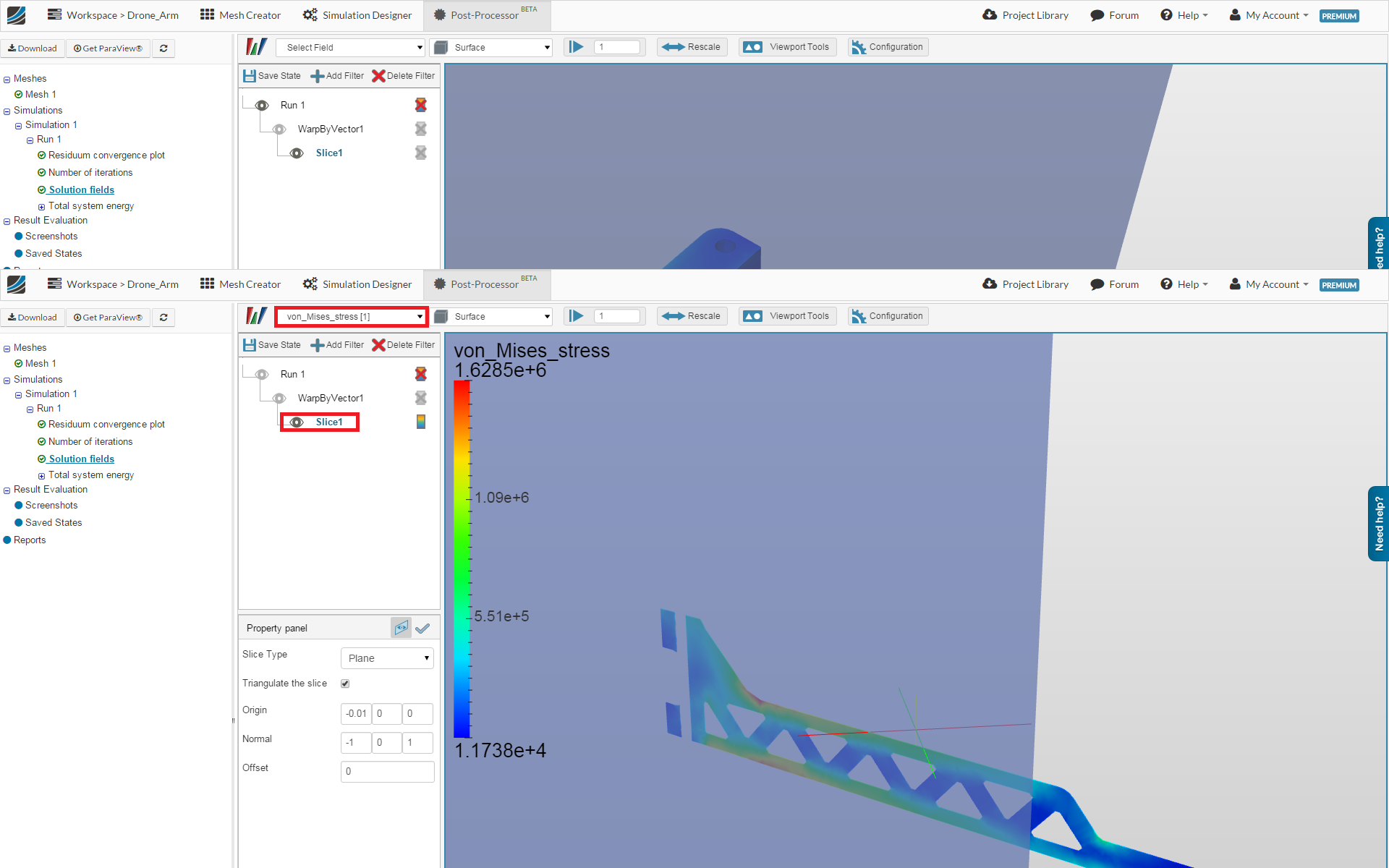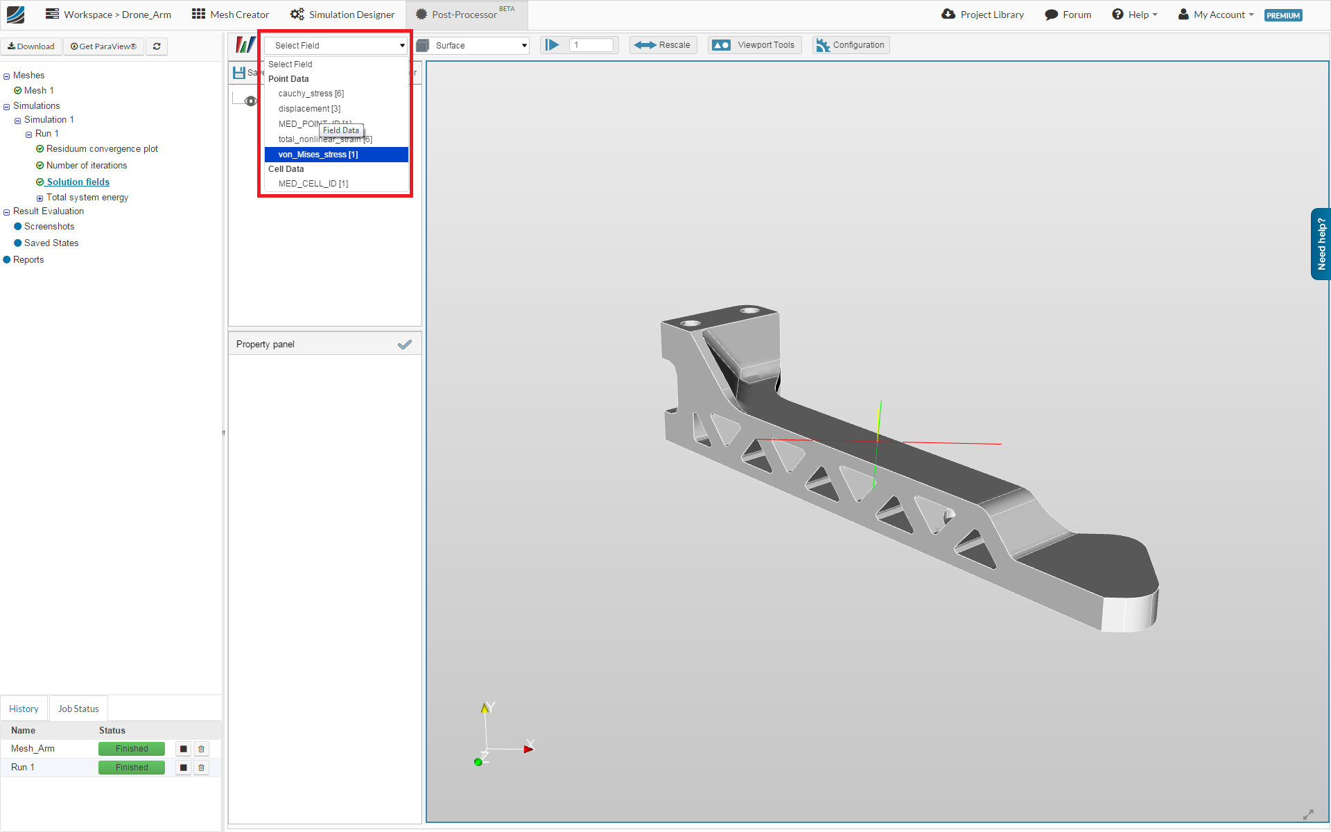 Jetzt können wir die Ergebnissfelder visualisieren. Das Select Field Drop-Down-Menü ermöglicht es die darzustelllende Größe (z. B. Spannung oder Dehnung) einzustellen.