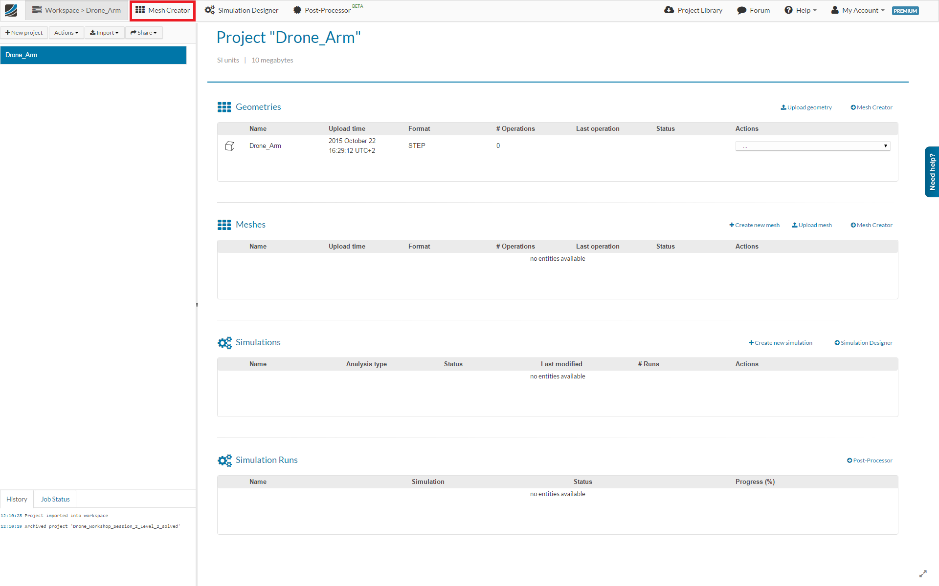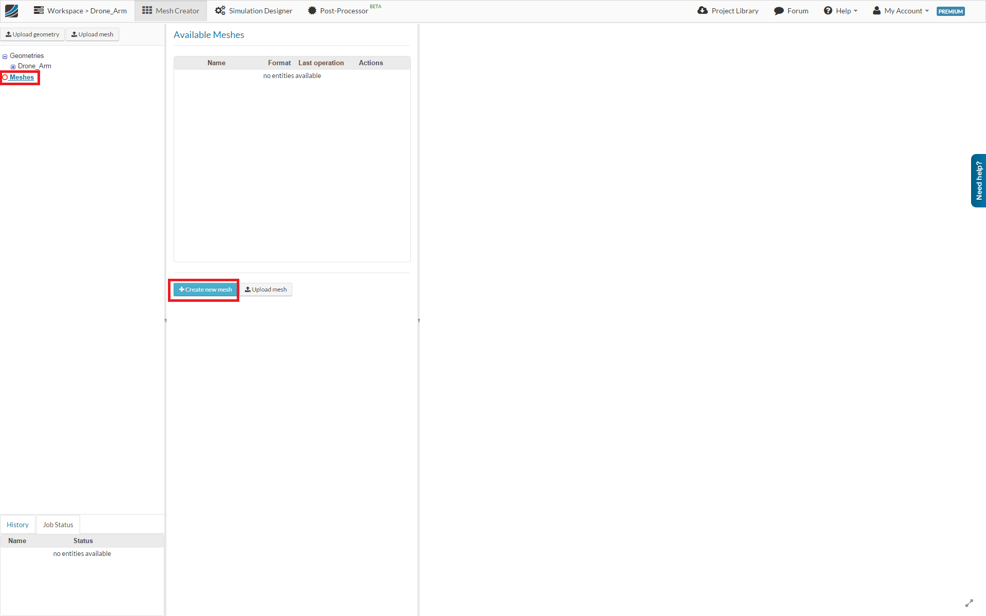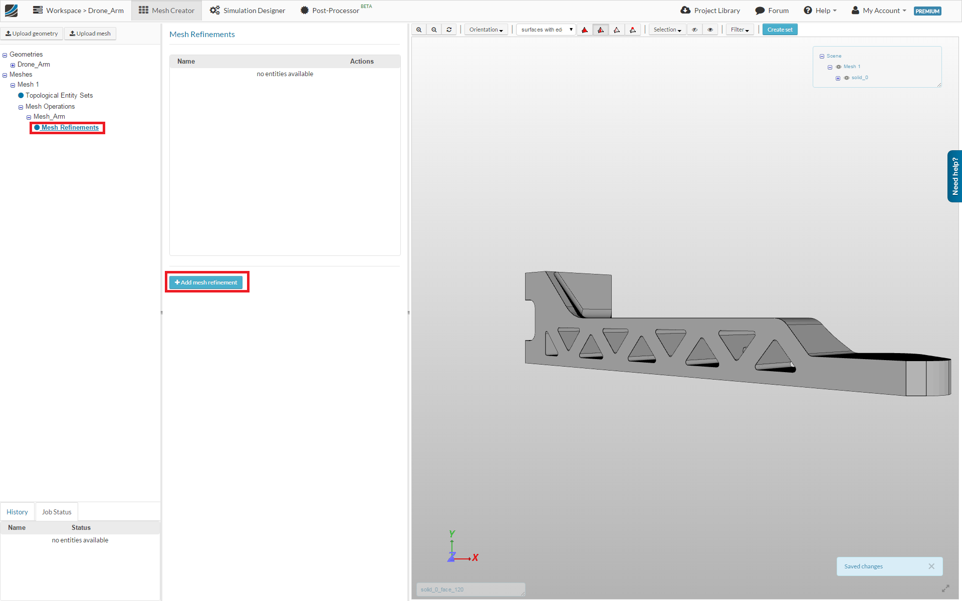 Klicke auf das Mesh Refinements Element welches dem *Project Tree auf der linken Seite hinzugefügt worde ist. Dies wird ein neues Menü in der Mitte öffnen wo alle Verfeinungstypen (auf engl. Refinements) zu finden sind.