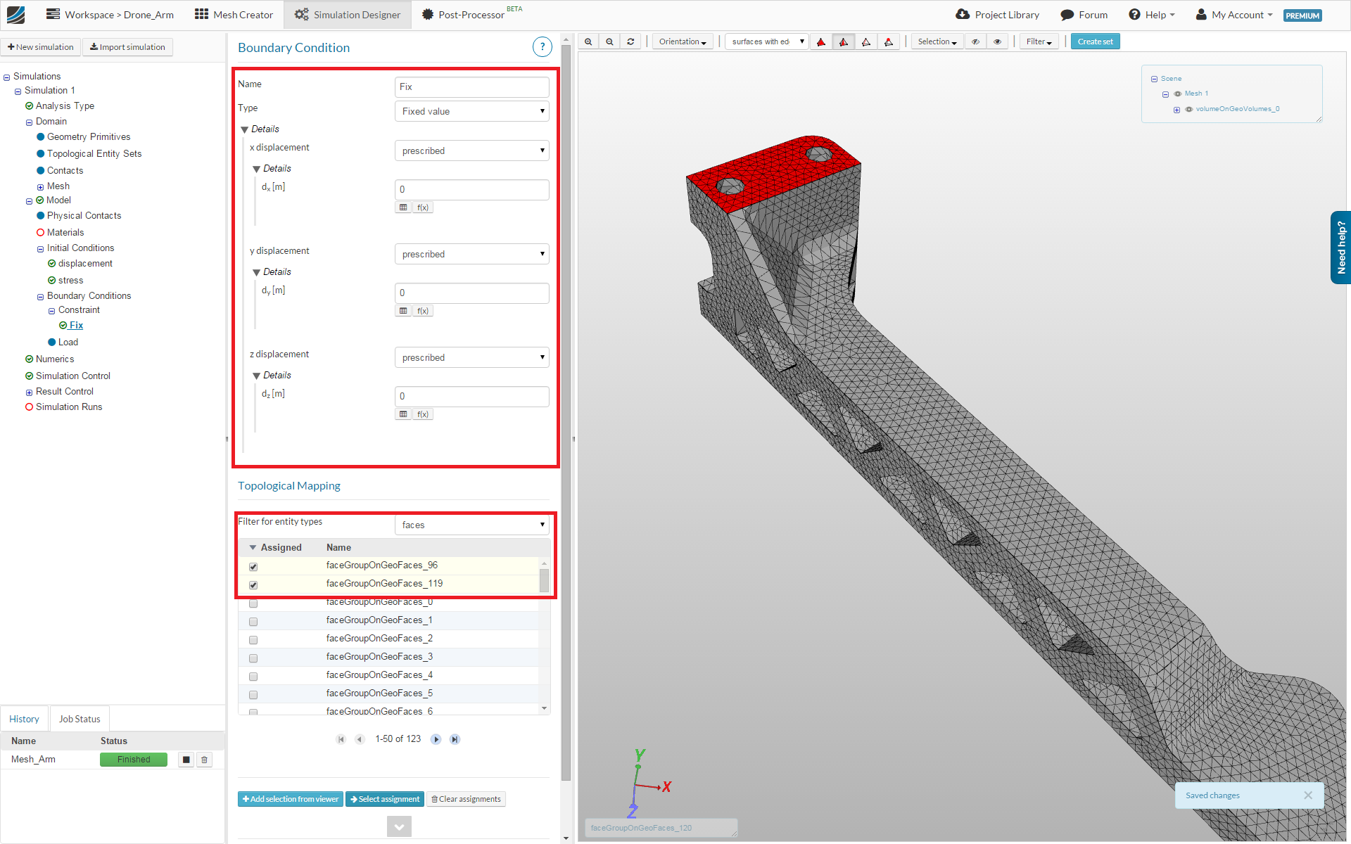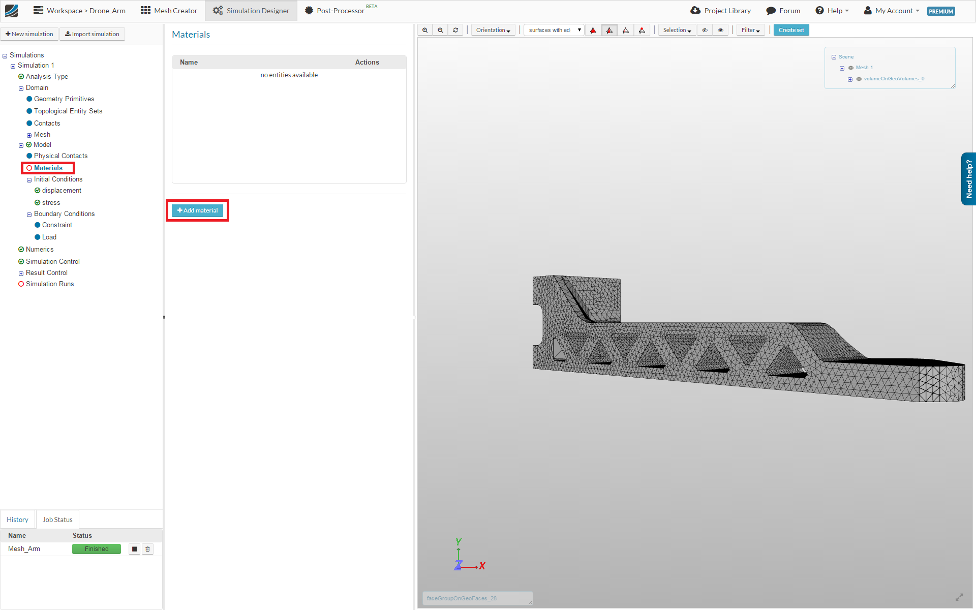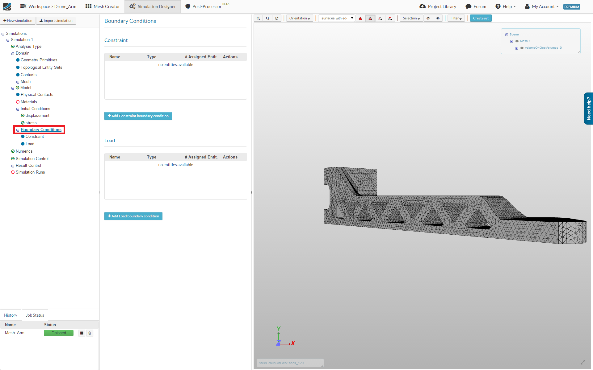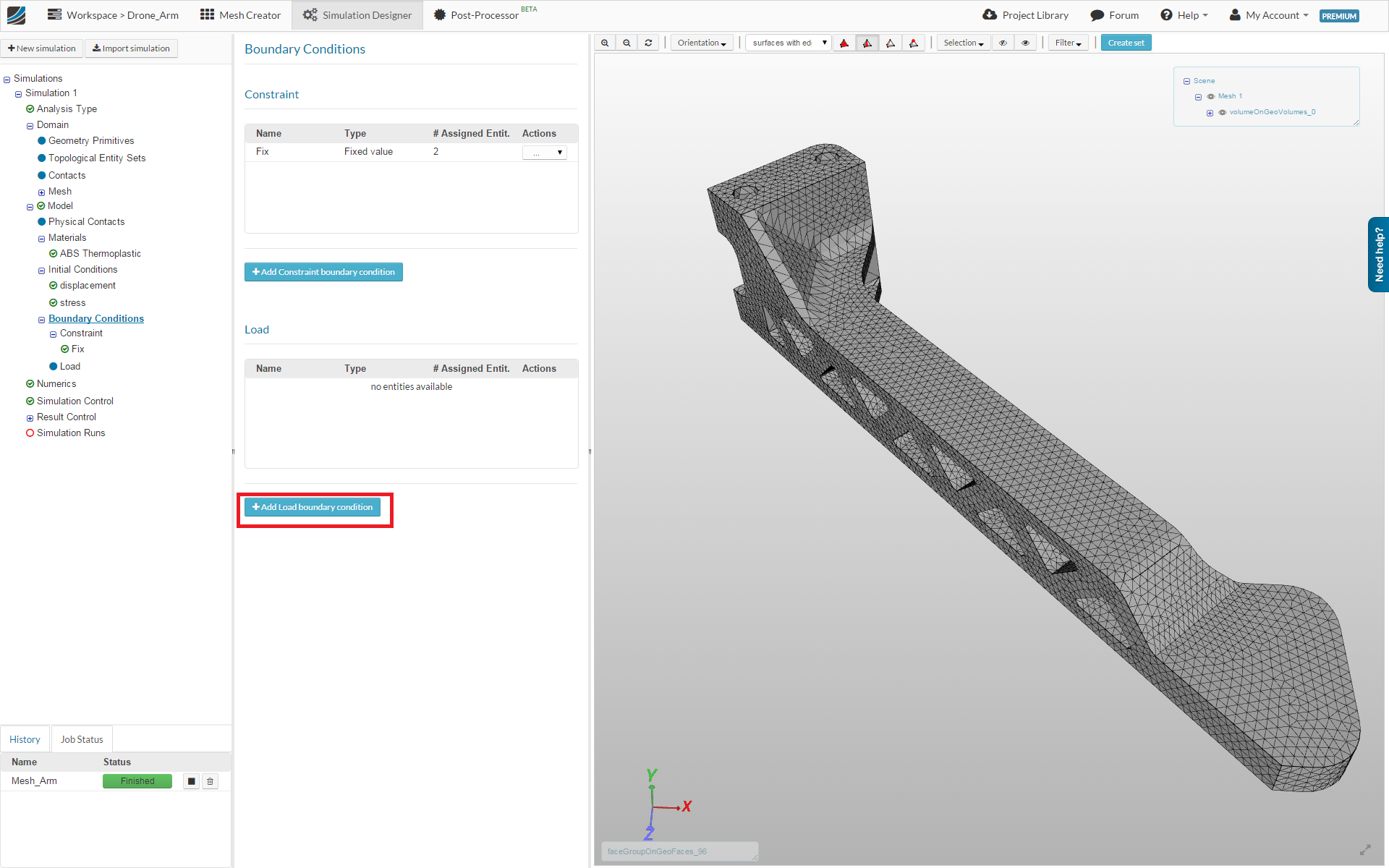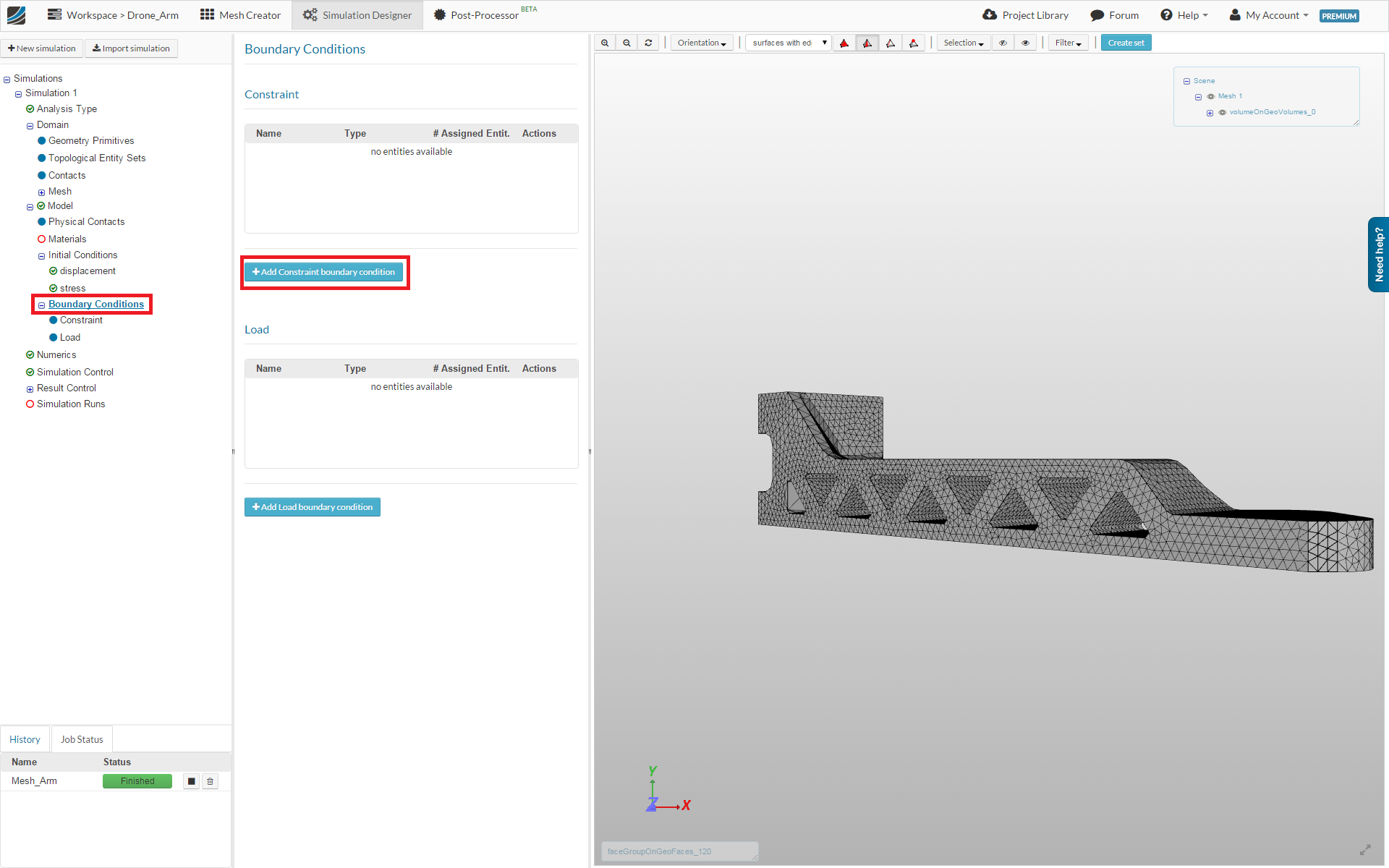 Als erstes werden wie eine Contraint Randbedingungen erstellen um den Arm zu fixieren. Klicke hierzu auf den Add Constraint boundary conditon Button.