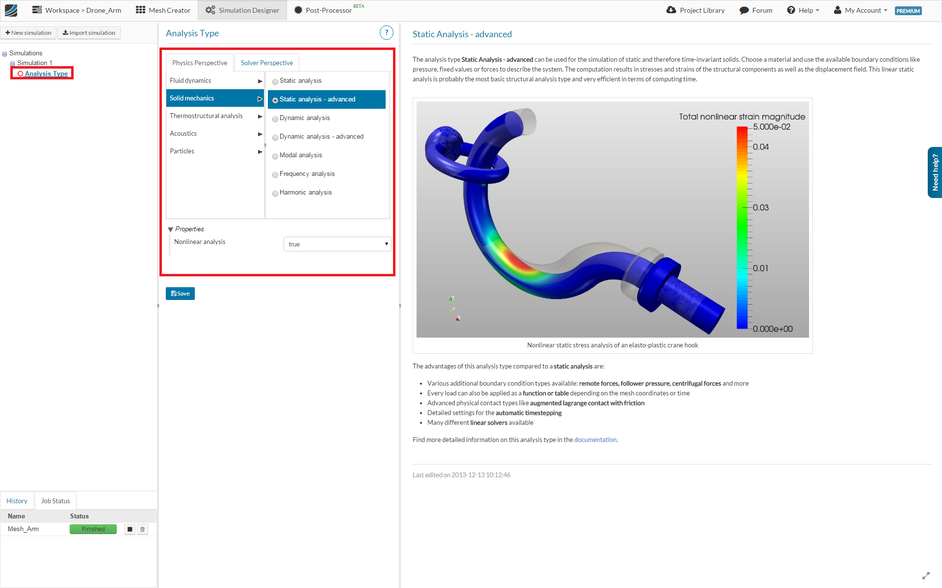 Dies wird ein zusätzliches Menü in der Mitte des Fensters erscheinen lassen. Hier kannst du auswählen welche Art von Simulation du durchführen möchtest. In unserem Fall werden wir eine Static analysis - advanced Simulation mit Non-linear Option durchführen.