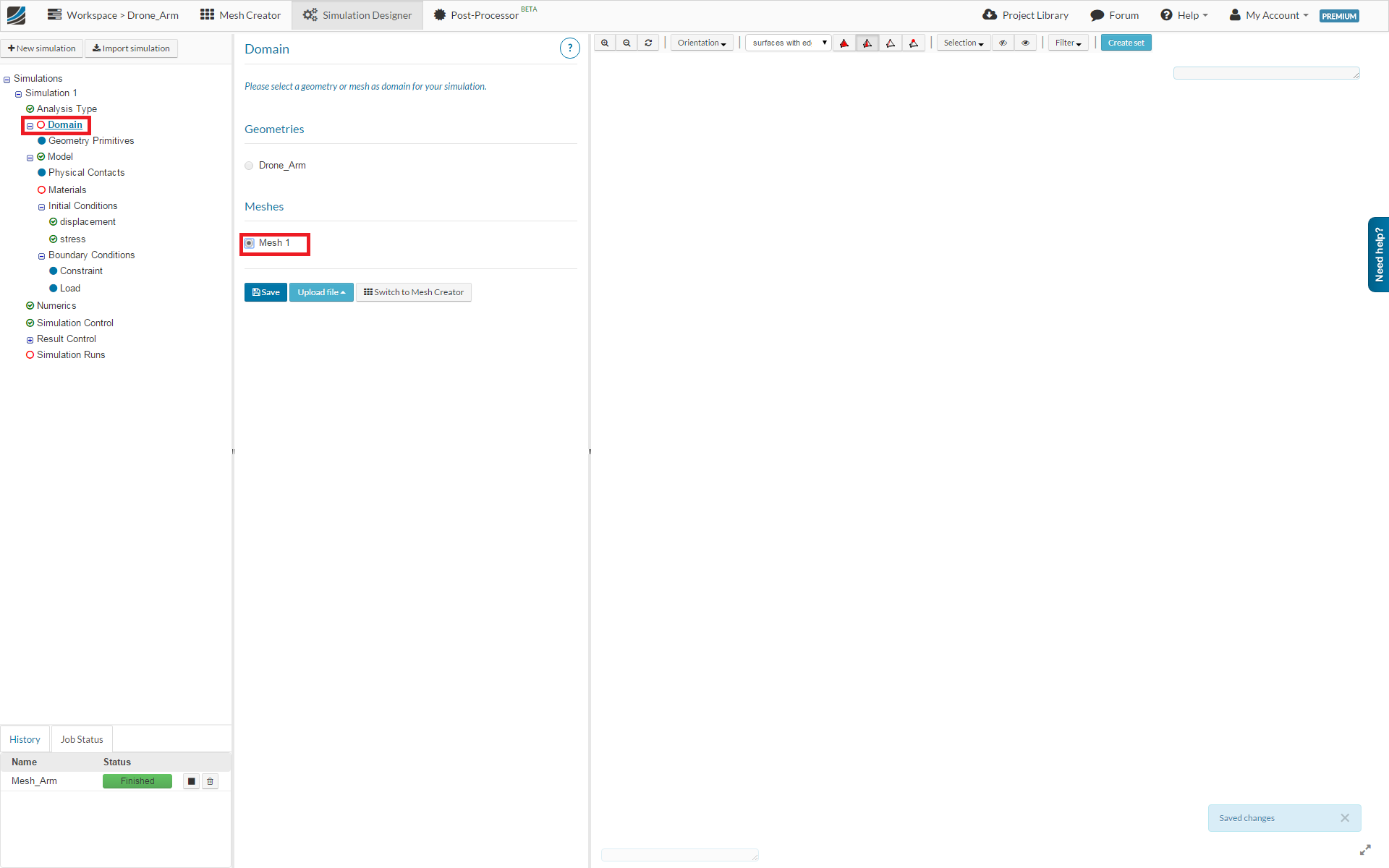 Als nächstes musst du auswählen welches Netz für die Simulation verwendet werden soll. Klicke hierzu auf das Domain Element im Project Tree und wähle dort Mesh_1 (aus dem neu erscheinend Menü in der Mitte) aus. Vergiss nicht deine Einstellungen zu speichern.