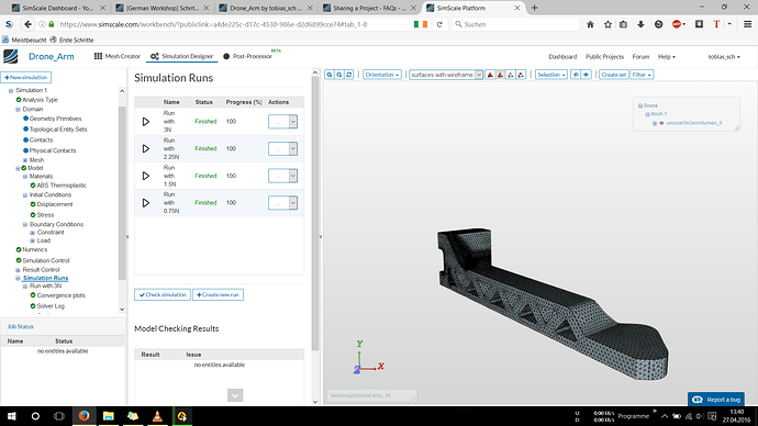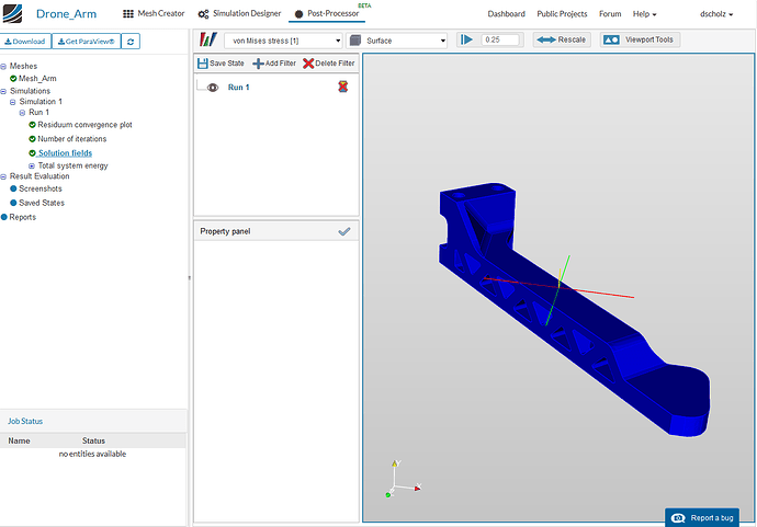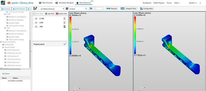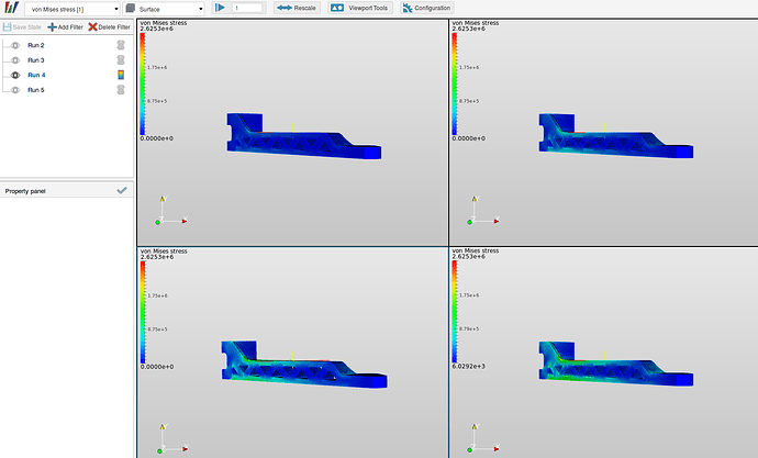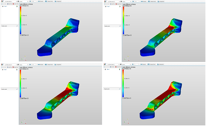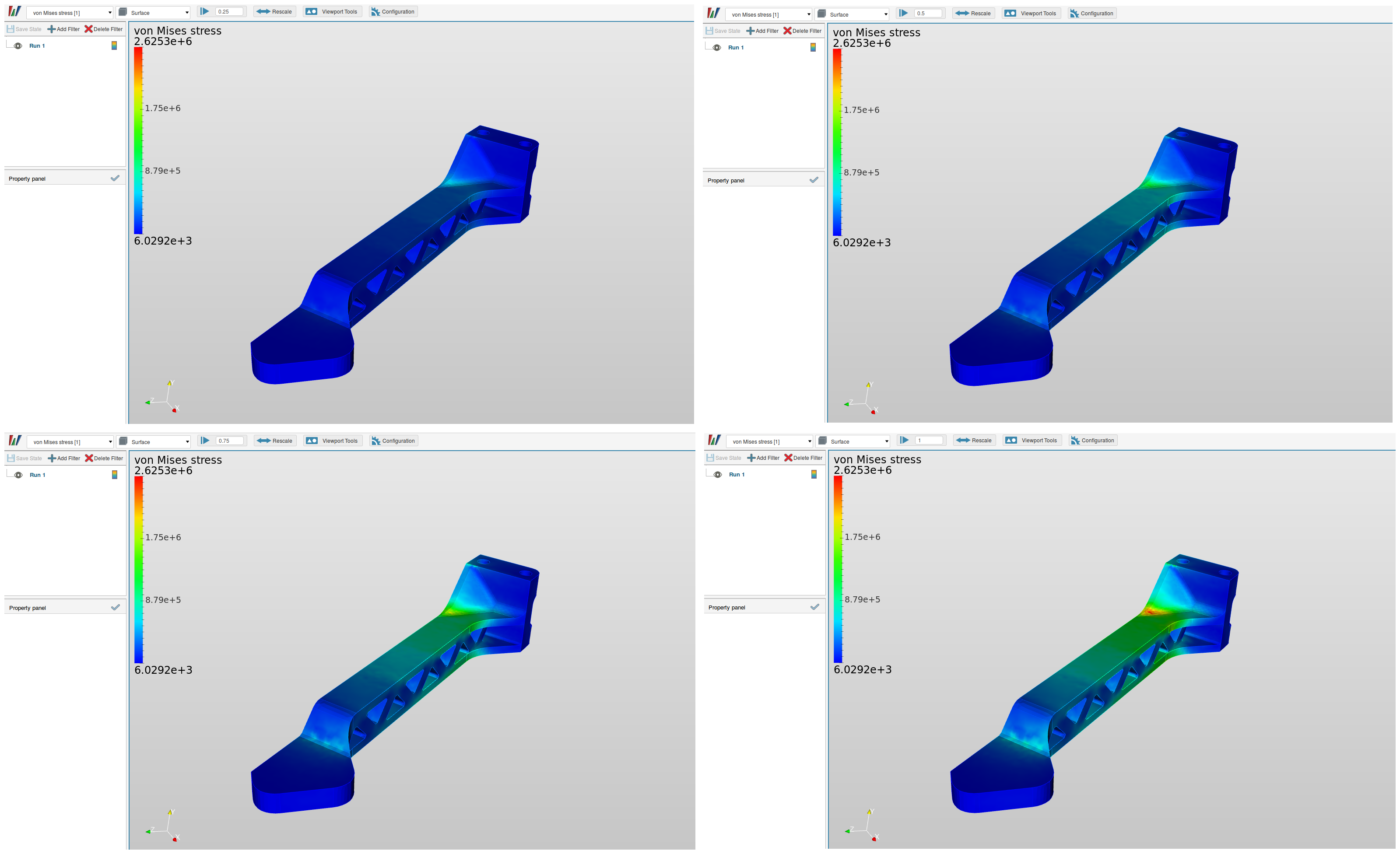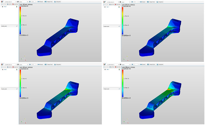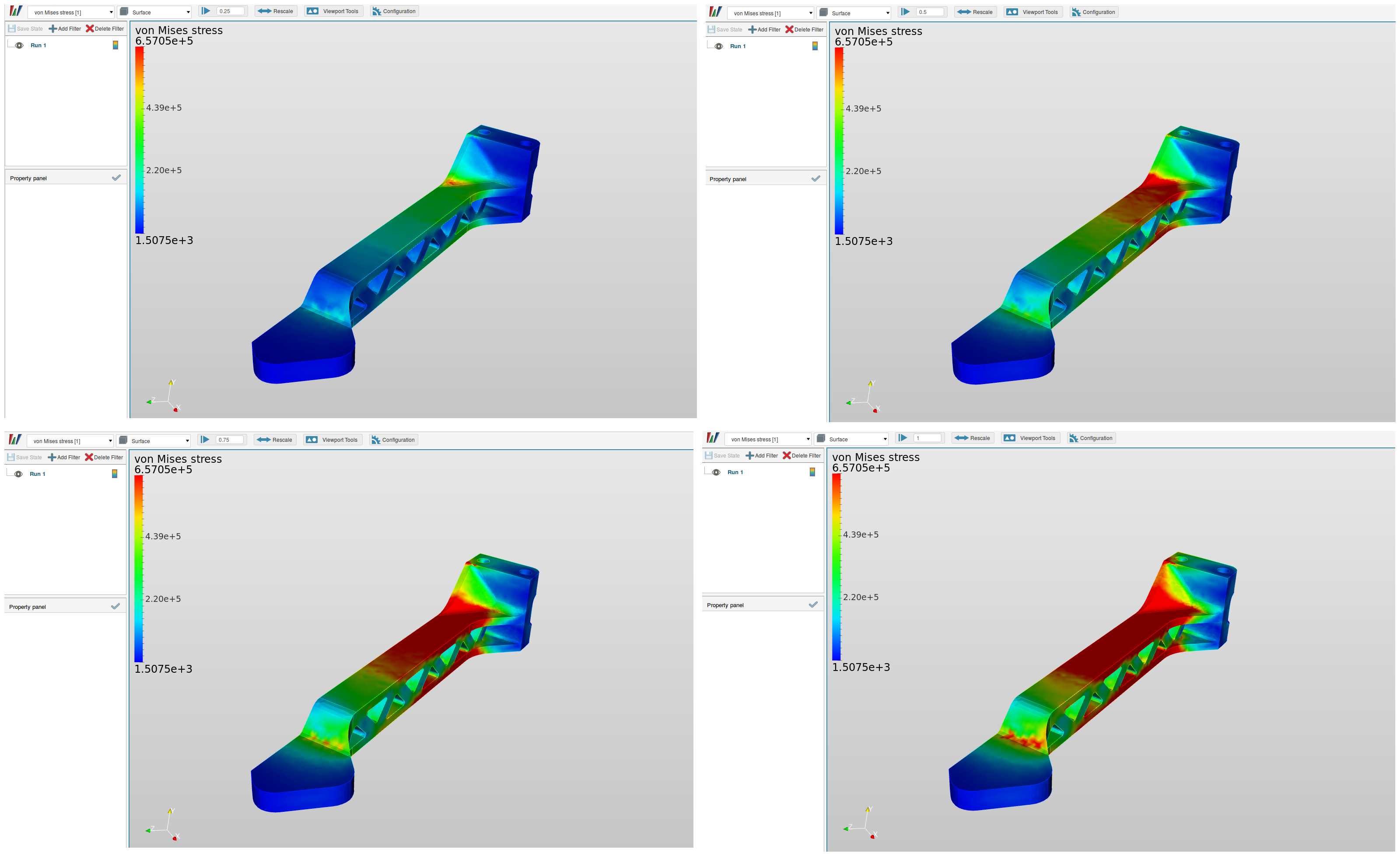 Jetzt zu @FJS Frage bezüglich der Einzelsimulationen. Leider lässt sich die Skalierung für verschiedene Resultate nicht speichern. Sprich um sinnvoll zu vergleichen macht es Sinn eine Skalierung zu wählen (z.B. letzter Lastfall) und diesen für die anderen 3 Fälle manuell einzugeben. Es gibt auch die Möglichkeit mehrere Results gleichzeitig im Post-Processor zu laden und mit der Split-Screen-Funktion nebeneinander darzustellen: