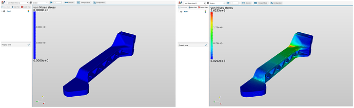 Wenn man ein Result lädt und ein Lösungsfeld z.b. von-Mises Spannung lädt passt sich die Skala erst mal an den aktuellen Zeitschritt an, um den vollen Wertebereich möglichst umfänglich “aufzulösen”. Sie passt sich dann beim ändern der Zeitschritte aber nicht mehr automatisch an. Das bedeutet, wenn man zu Beginn das Lösungsfeld (von-Mises-Spannung) auswählt beim ersten Zeitschritt, der in unserer Analyse den lastfreien Zustand darstellt, wird die Skala komplett auf null gestellt (siehe im Screenshot links). Stellt man jetzt einen anderen Zeitschritt mit Last ein (z.B. den letzten zum Zeitpunkt 1) wird immer noch alles bezogen auf die “Nullskala” dargestellt, daher ist alles blau eingefärbt. Wenn man jedoch zuerst den Zeitschritt einstellt (z.B. 1) und dann das Feld wählt, wird per default auf den jetzigen Zeitschritt skaliert, also passt sich die Skala dem Maximalbereich des letzten Zeitschritts an (im Screenshot rechts). Das gleiche Resultat erreicht man, wenn man nachträglich manuell auf den Wertebereich skaliert.